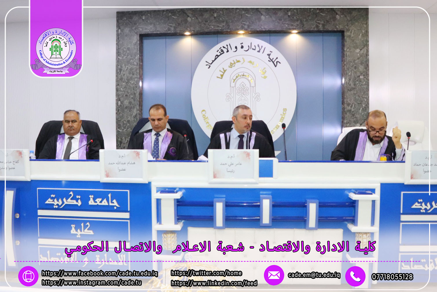 نوقشـت في كليـة الإدارة والاقتصاد رسالة الماجستير في العلوم الإدارية للطالــبة رشا سالم داود الموسـومة (دور الثقافة التنظيمية في تحقيق التفوق الاستراتيجي من خلال الممارسات الخضراء لإدارة الموارد البشرية: دراسة استطلاعية لآراء عينة من العاملين في شركة مابين النهرين العامة للبذور) بأشــراف ا.م. كفاح عباس محيميد.
