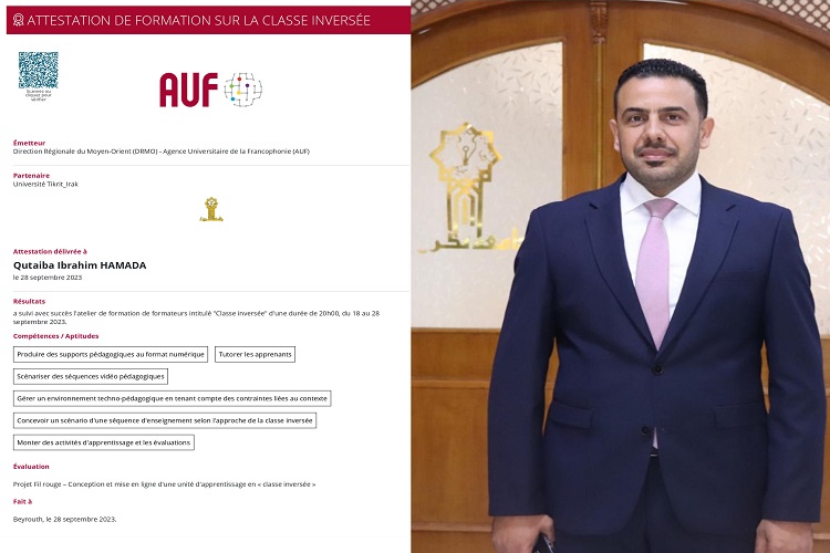 في إطار المنهاج الوزاري الذي أعدته وزارة التعليم العالي والبحث العلمي لتسريع التحول الرقمي في الجامعات العراقية، وبالتعاون مع الوكالة الجامعية الفرانكفونية الفرنسية (AUF) للتحويل الرقمي للتعليم العالي في الشرق الأوسط، حقق مجموعة من التدريسيين في كلية الإدارة والاقتصاد / جامعة تكريت إنجازاً مميزاً بحصولهم على شهادة متدرب دولية في موضوع "الصف المعكوس". التدريسيون الذين حصلوا على الشهادة هم كل من السادة: