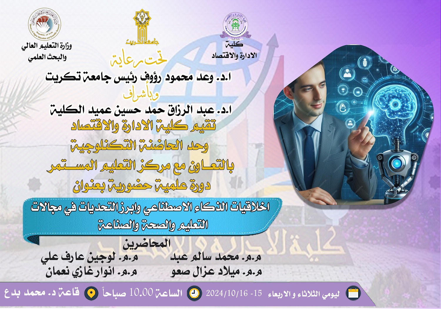 دورة علمية حضورية بعنوان اخلاقيات الذكاء الاصطناعي وابرز التحديات في مجالات : التعليم والصحة والصناعة