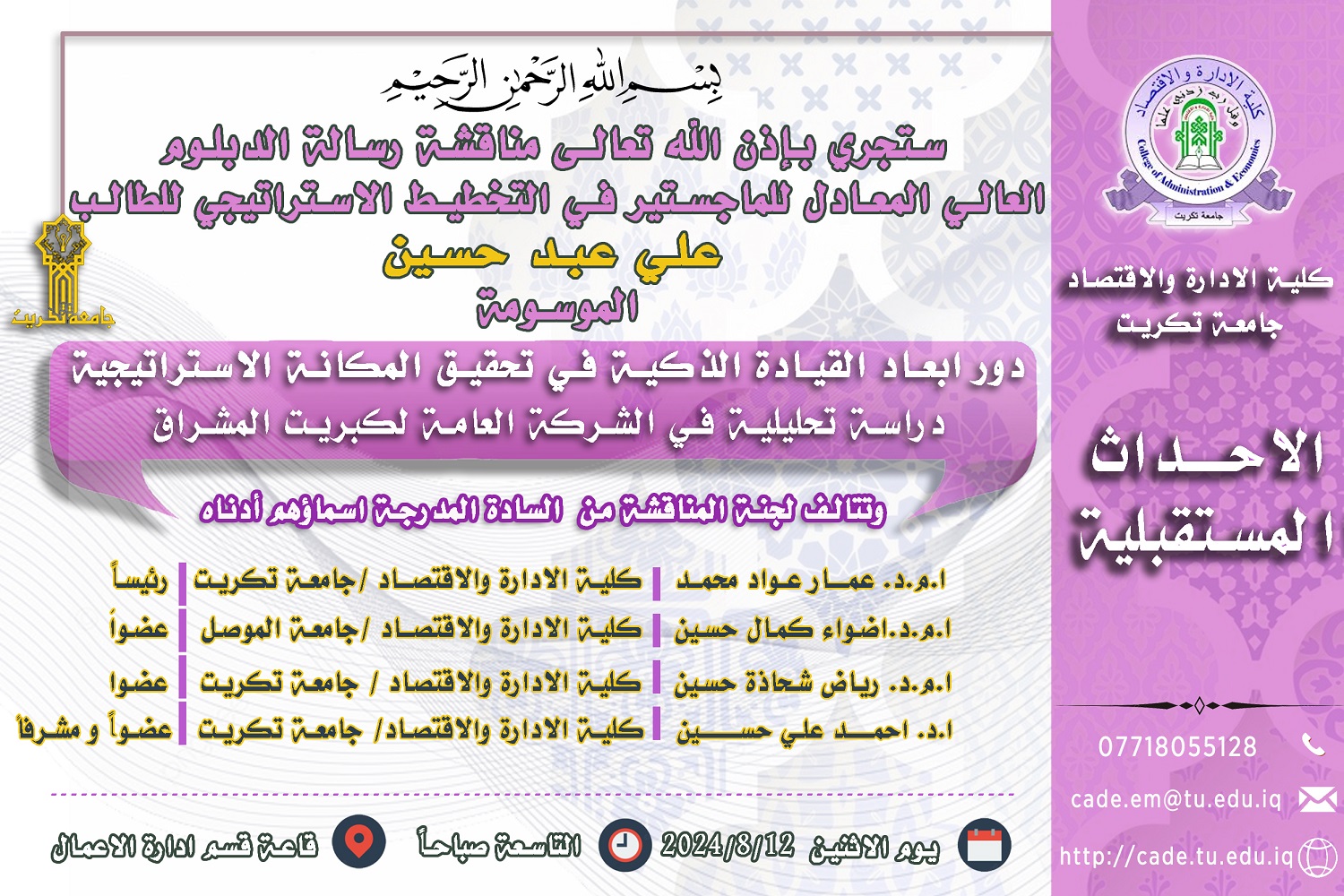 ستجري بإذن الله تعالـى مناقشة رسالة الدبلوم العالي المعادل للماجستير في التخطيط الاستراتيجي للطالب علي عبد حسين