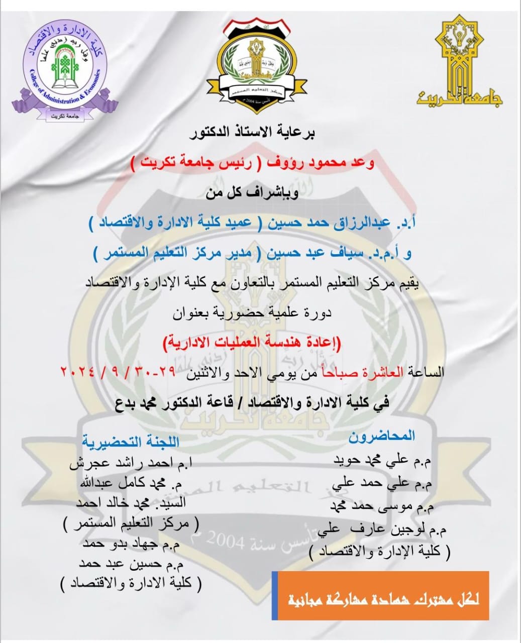 دورة علمية حضورية بعنوان إعادة هندسة العمليات الإدارية