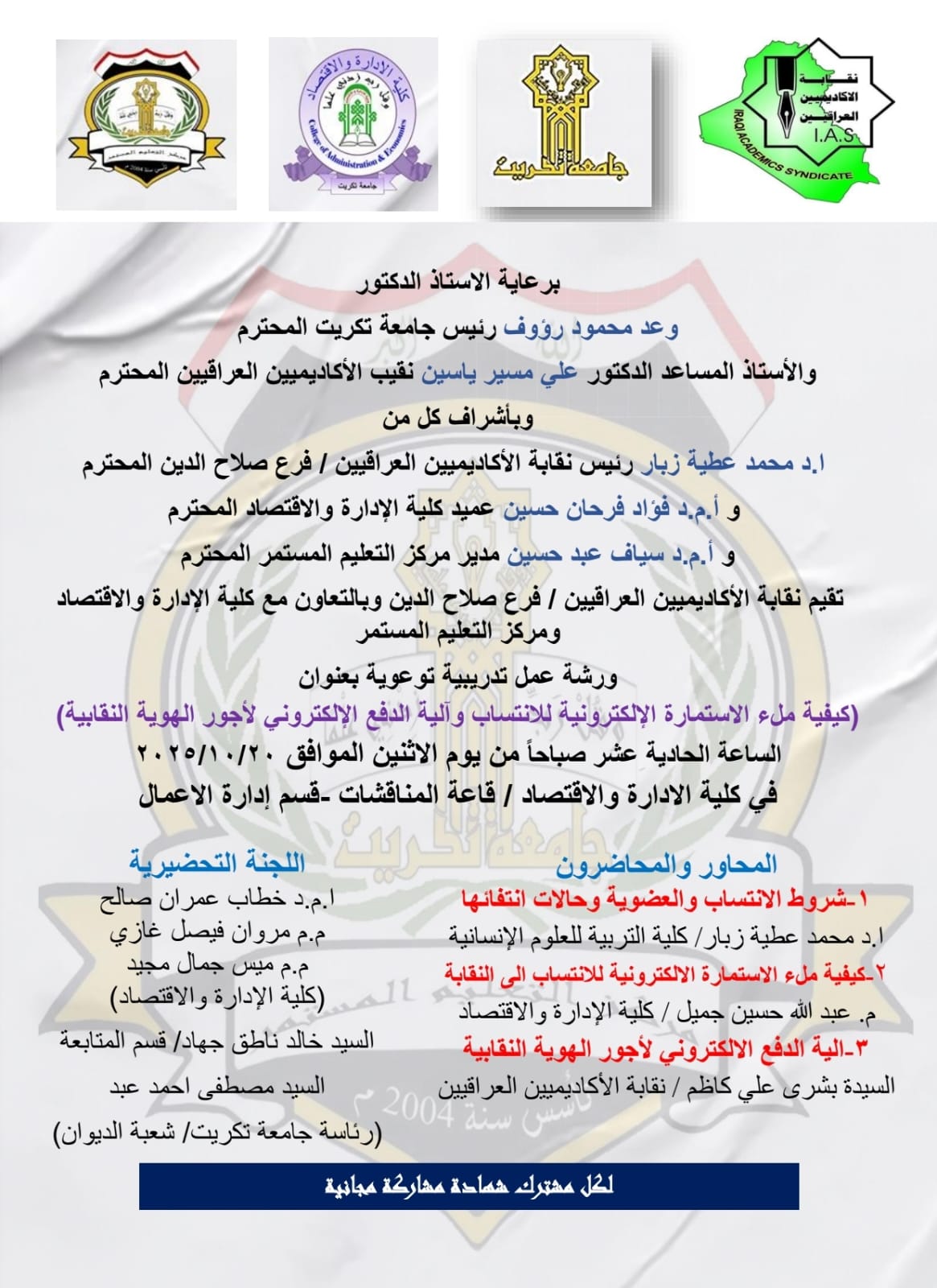 ستُعقد بأذن الله تعالى ورشة عمل تدريبية توعوية بعنوان (كيفية ملء الاستمارة الإلكترونية للانتساب وآلية الدفع الإلكتروني لأجور الهوية النقابية)