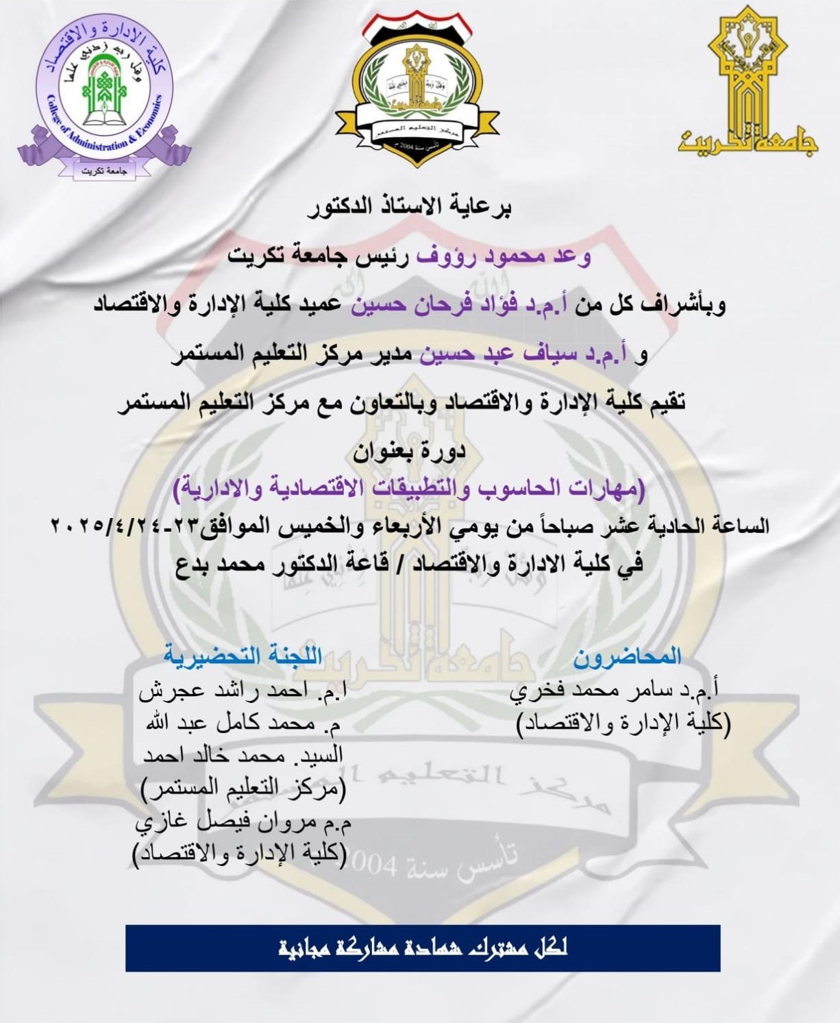 دورة بعنوان مهارات الحاسوب والتطبيقات الاقتصادية والإدارية