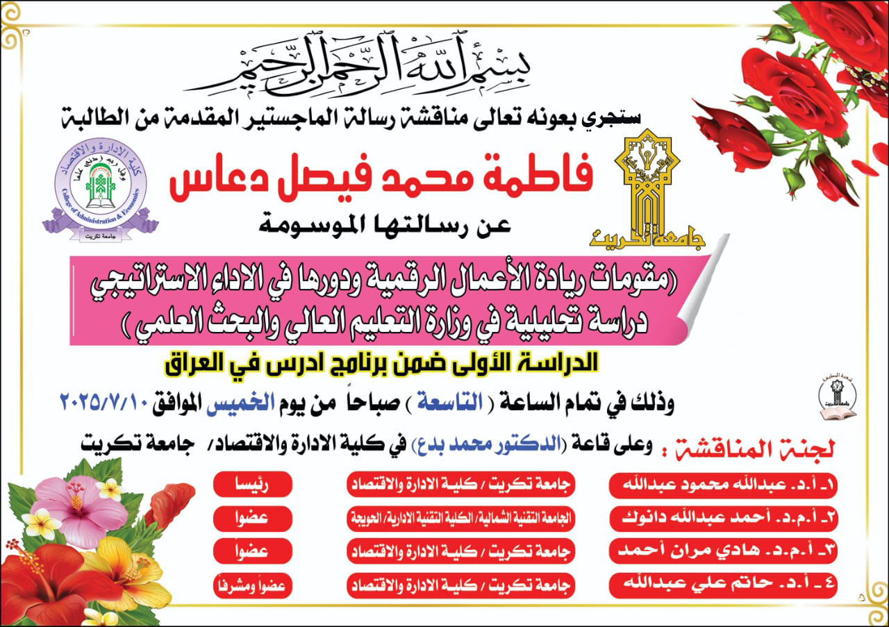 ستجري بإذن الله تعالـى مناقشة رسالة الماجستير فــي العلوم الادارية للطالــبة فاطمة محمد فيصل دعاس