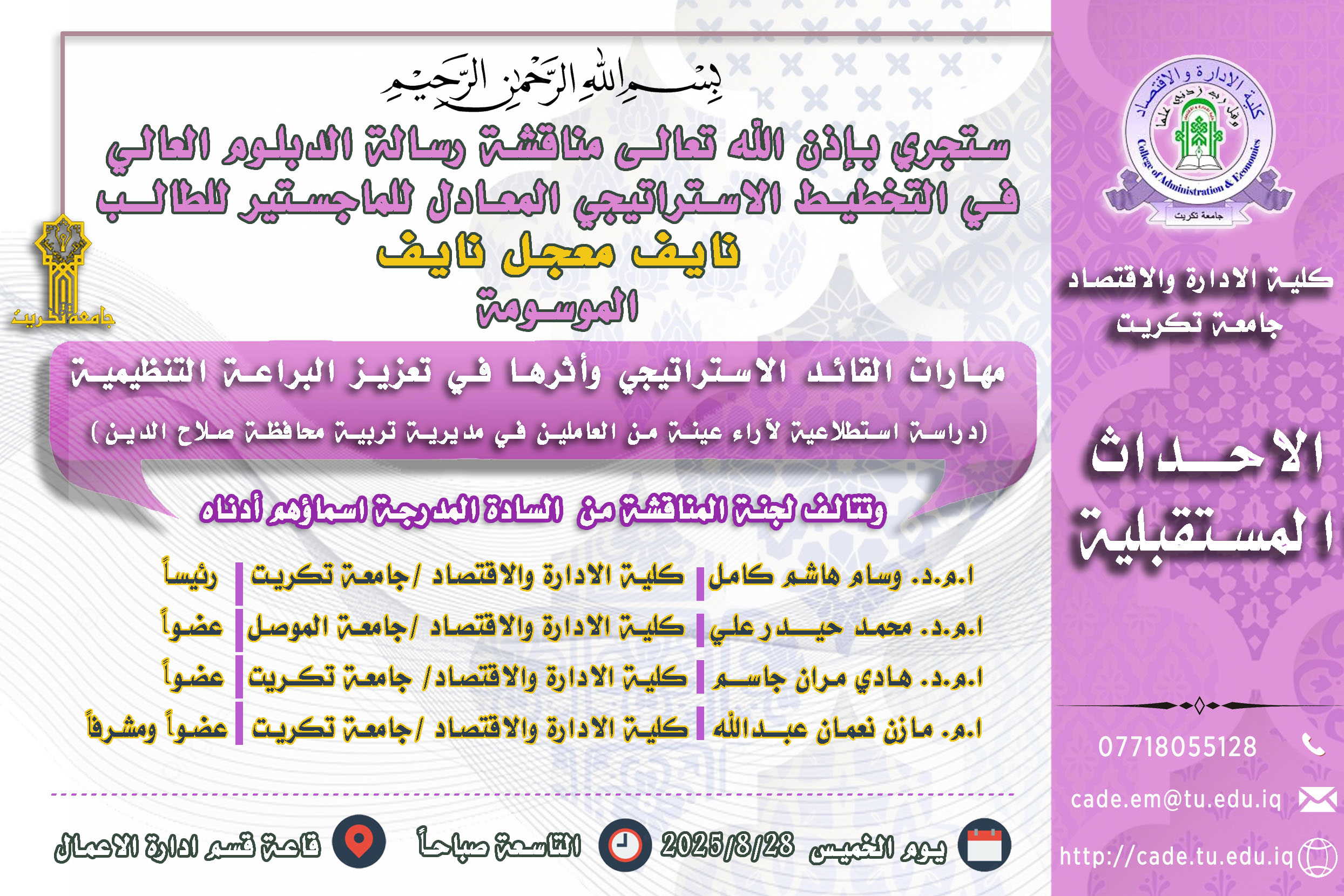 ستجري بإذن الله تعالـى مناقشة رسالة الدبلوم العالي في التخطيط الاستراتيجي المعادل للماجستير للطالــب نايف معجل نايف
