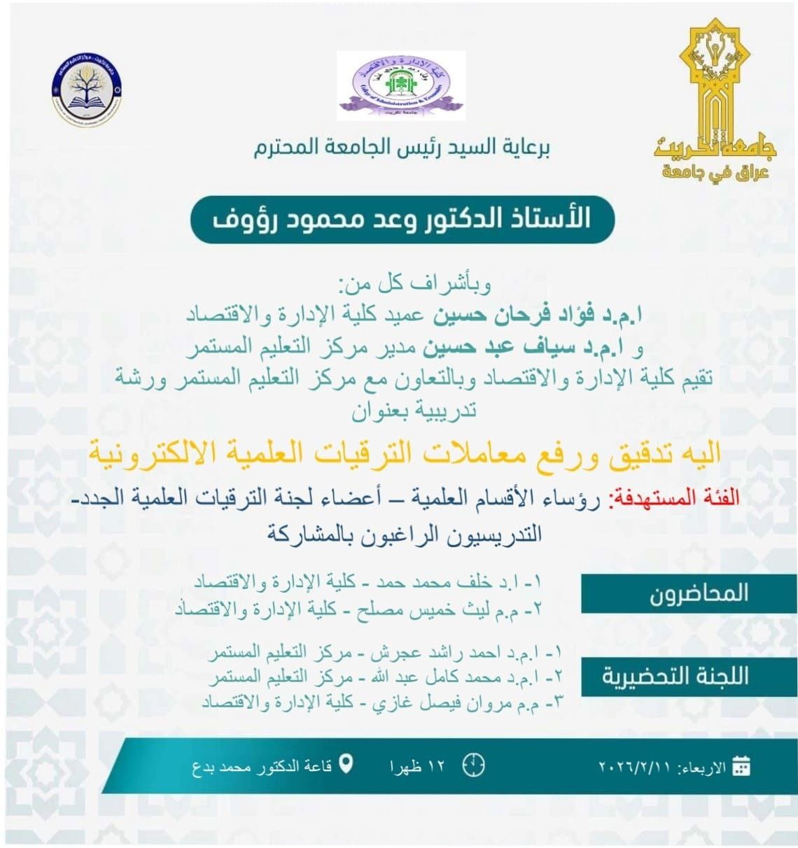 ستعقد بأذن الله تعالى يوم الأربعاء الموافق 2026/2/11 ورشة تدريبية بعنوان ( الية تدقيق ورفع معاملات الترقيات العلمية الالكترونية )