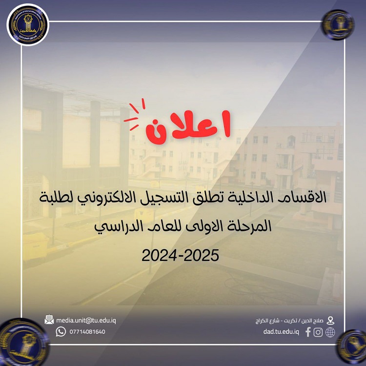 تنفيذاً لتوجيهات رئيس جامعة تكريت ا.د. وعد محمود رؤوف المحترم يعلن قسم شؤون الاقسام الداخلية في جامعة تكريت انطلاق التسجيل الالكتروني "عبر منصة اور" لطلبة المرحلة الاولى للسكن في القسم الداخلي عبر الرابط الالكتروني بدءً من اليوم الثلاثاء المصادف 22/10/2024.
