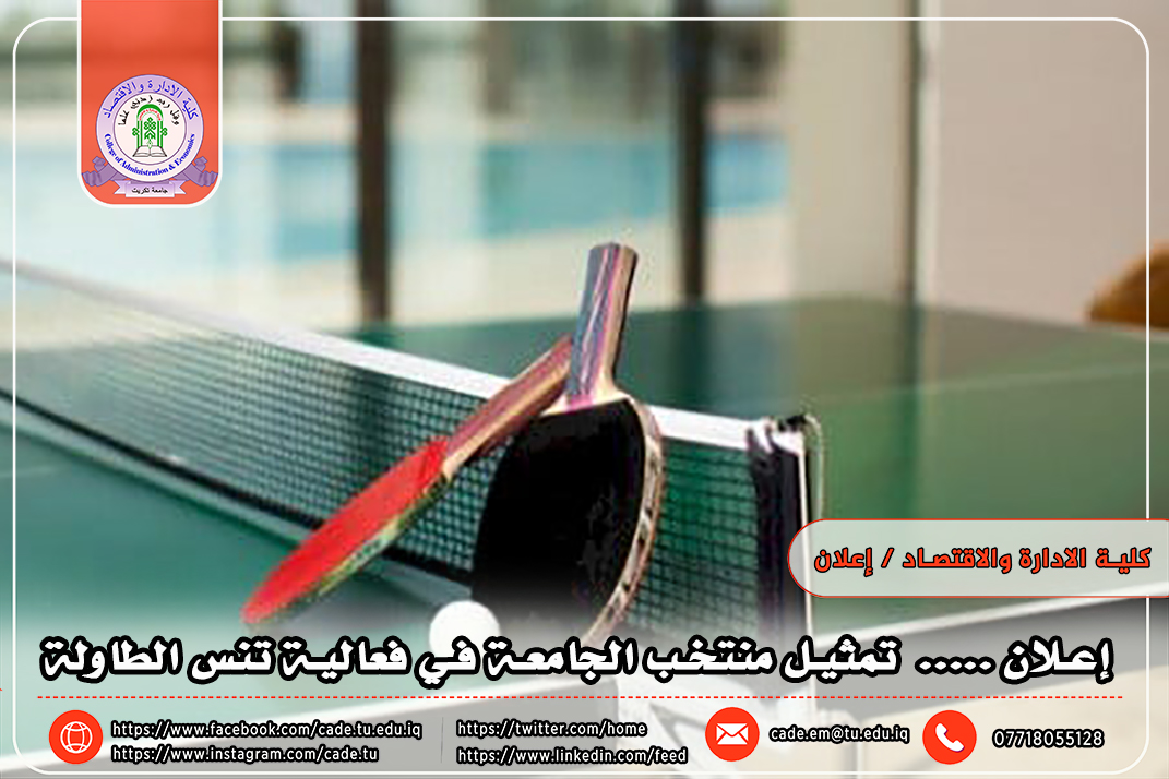 تدعو كلية الإدارة والاقتصاد في جامعة تكريت جميع الطلبة من مختلف الأقسام الذين يمتلكون مهارات في رياضة تنس الطاولة (المنضدة) والريشة الطائرة إلى التواصل مع السيد مدير الشعبة الرياضية في قسم النشاطات الطلابية. تأتي هذه الدعوة بهدف اختيار فريق يمثل الجامعة في بطولة الجامعات العراقية لتنس الطاولة والريشة الطائرة.