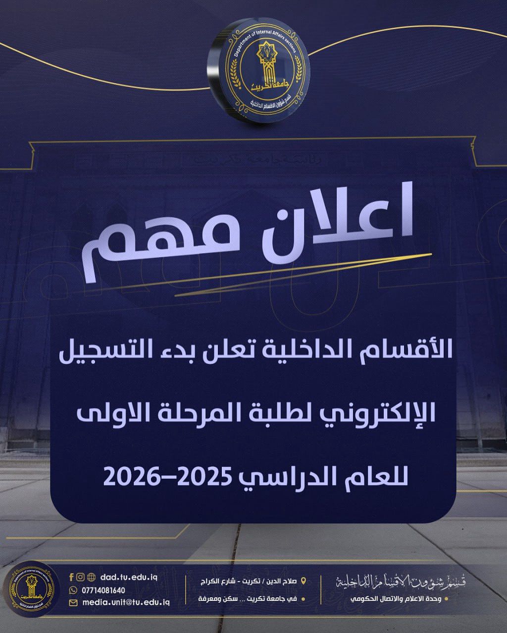 تعلن الأقسام الداخلية في جامعة تكريت عن بدء التسجيل الإلكتروني لطلبة المرحلة الأولى المقبولين في كليات الجامعة للعام الدراسي 2025–2026، وذلك عبر منصة اور الإلكترونية المخصصة من قبل وزارة التعليم العالي والبحث العلمي.