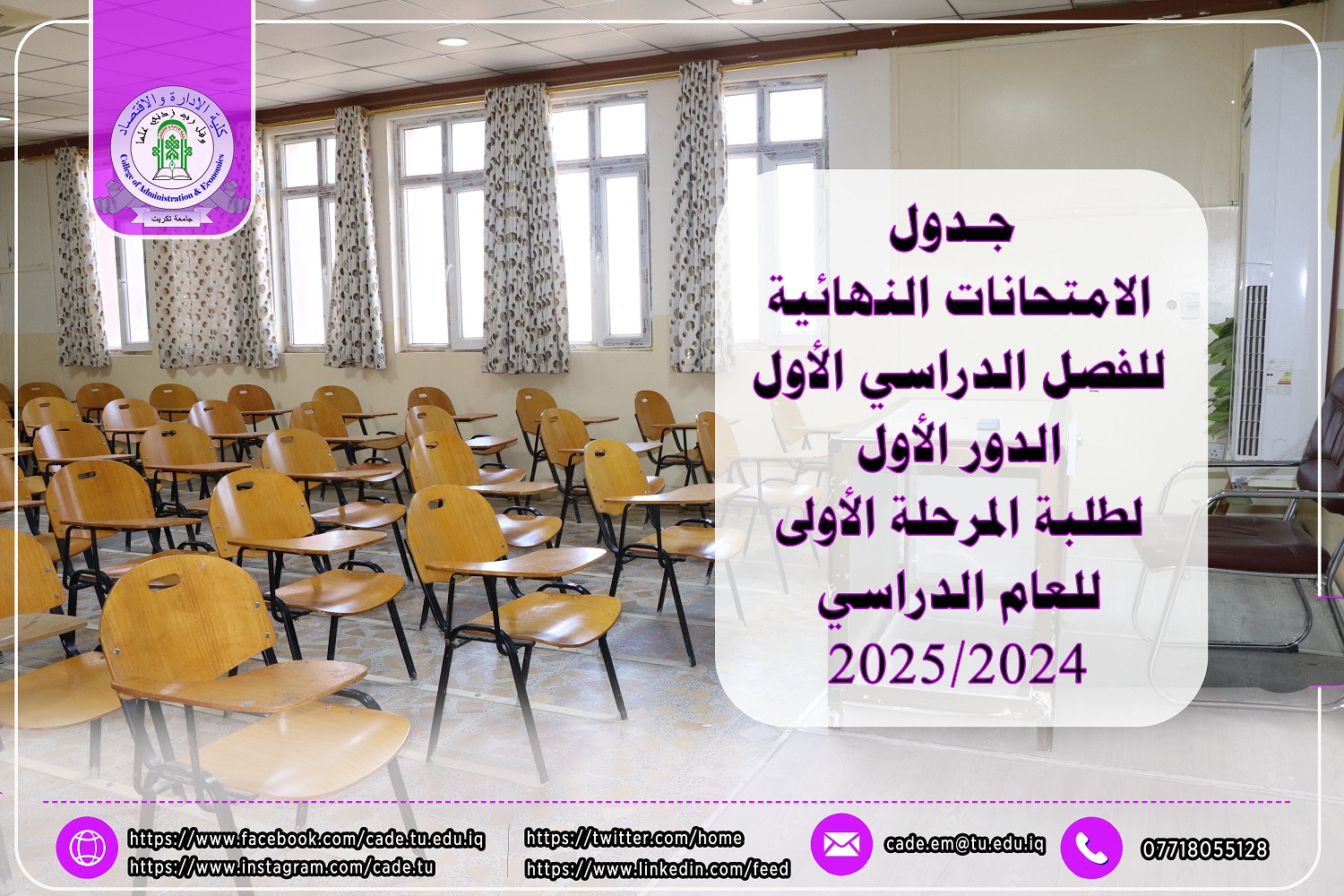يسرُّ عمادة كلية الإدارة والاقتصاد أن تُعلن لطلبتنا الأعزاء في المرحلة الأولى، للدراستين الصباحية والمسائية، عن نشر جدول الامتحانات النهائية للفصل الدراسي الأول / الدور الأول للعام الدراسي 2024-2025.