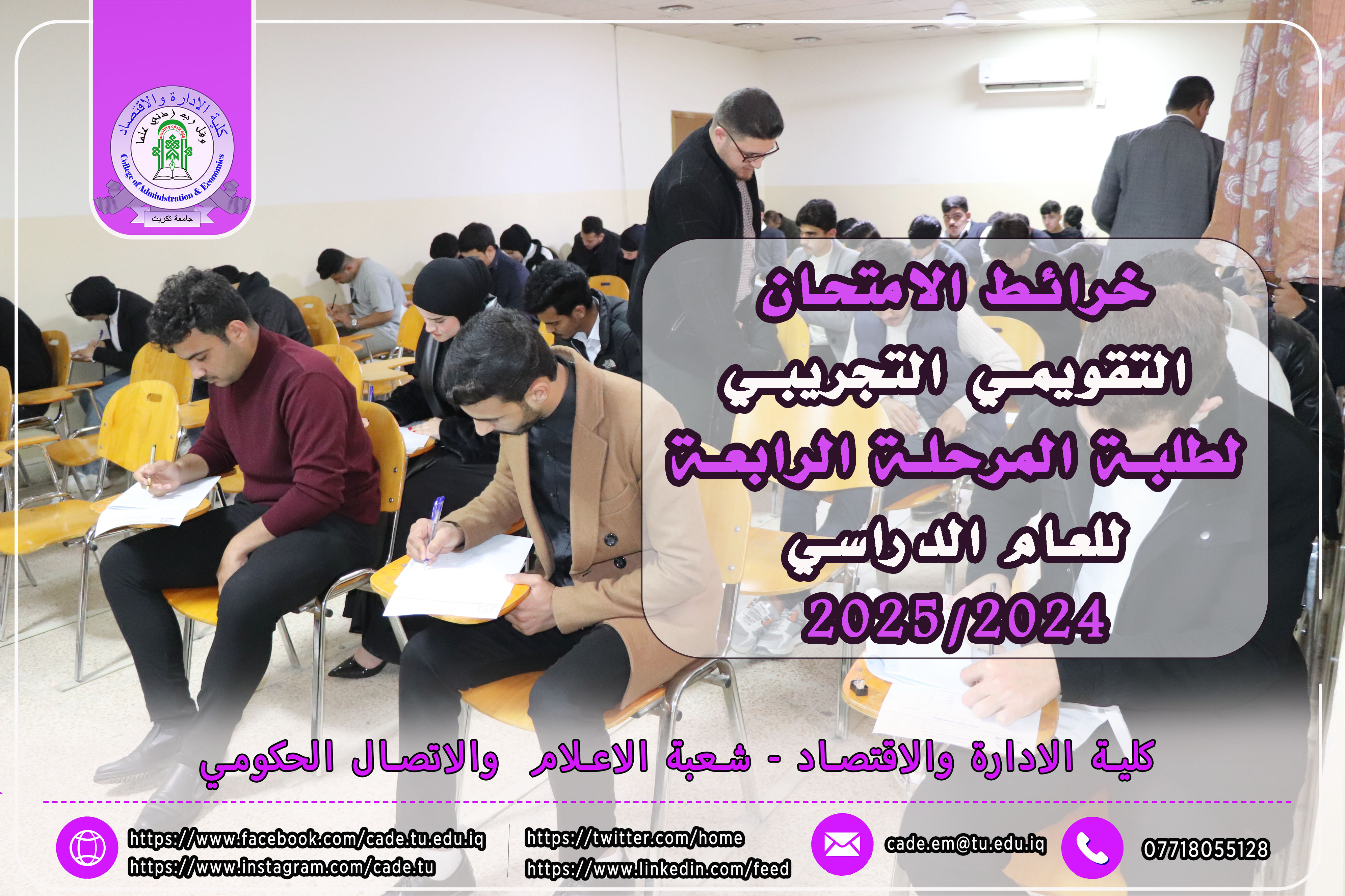 في إطار الاستعدادات الجارية لإنجاح العملية الامتحانية، تعلن كلية الإدارة والاقتصاد في جامعة تكريت عن نشر خرائط الامتحان التقويمي التجريبي لطلبة المرحلة الرابعة في الدراستين الصباحية والمسائية، وذلك لقسمي إدارة الأعمال والمحاسبة، للفصل الدراسي الثاني العام الدراسي 2024-2025.