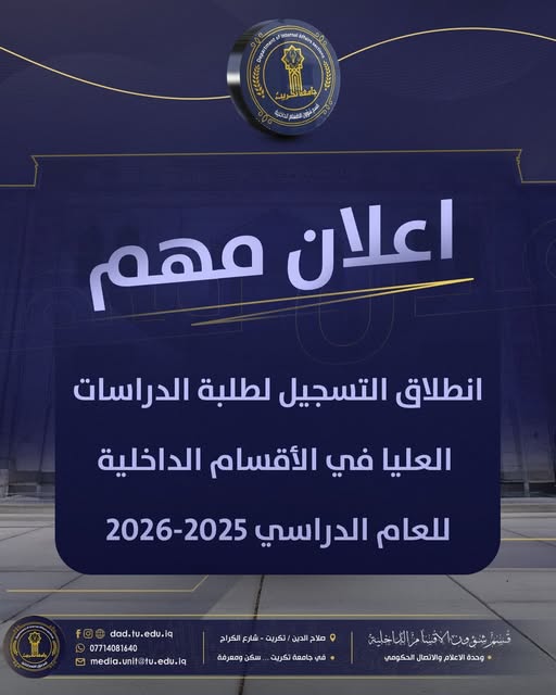 علن الأقسام الداخلية في جامعة تكريت عن المباشرة باستقبال طلبات التسجيل الخاصة بطلبة الدراسات العليا للعام الدراسي 2025–2026، ضمن إطار الخطة الهادفة إلى تهيئة بيئة سكنية مناسبة تدعم المسيرة العلمية للطلبة.
