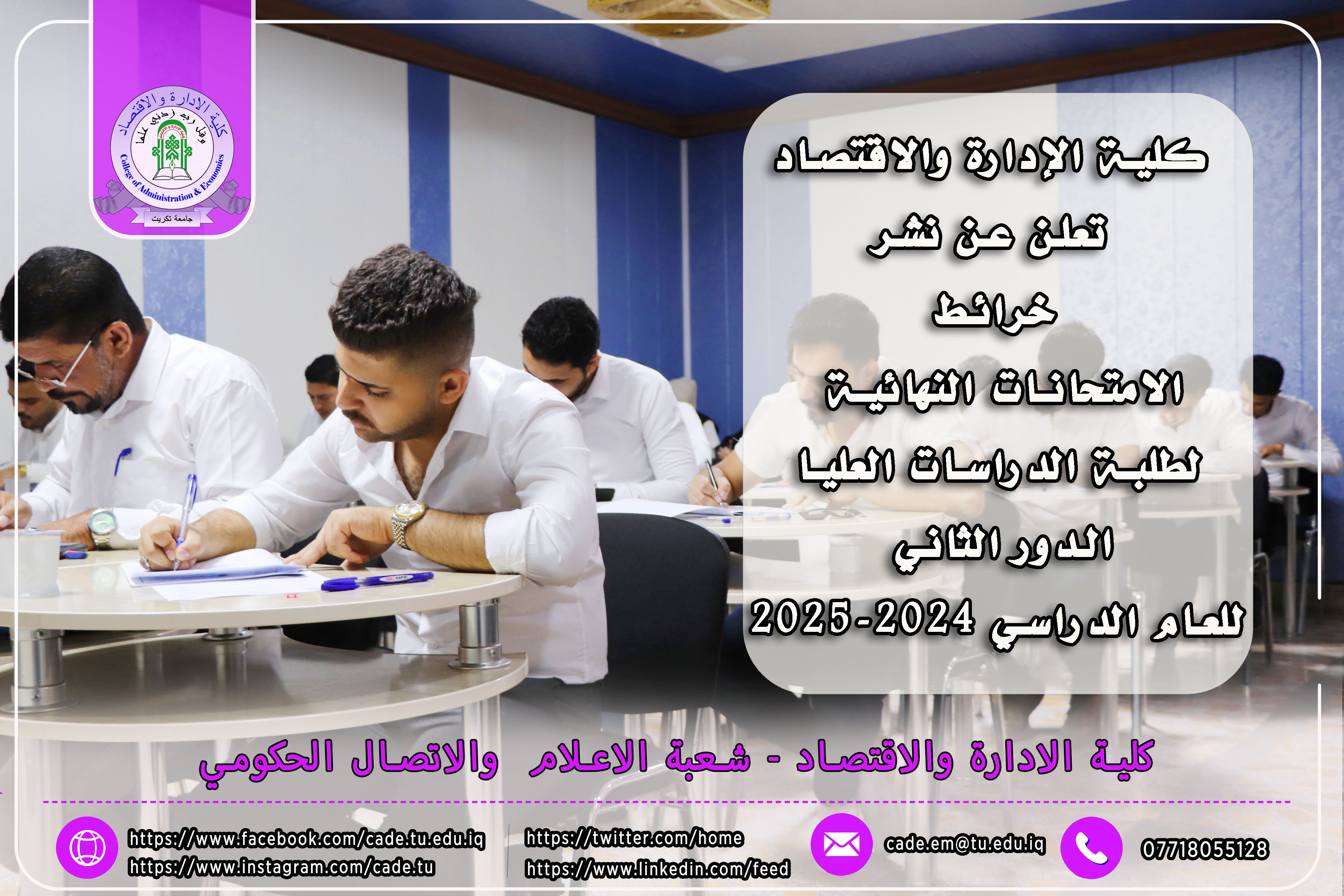 تُعلن عمادة كلية الإدارة والاقتصاد في جامعة تكريت عن نشر خرائط الامتحانات النهائية لطلبة الدراسات العليا للدور الثاني للعام الدراسي 2024-2025، وذلك ابتداءً من يوم الاثنين الموافق 1 / 9 / 2025.