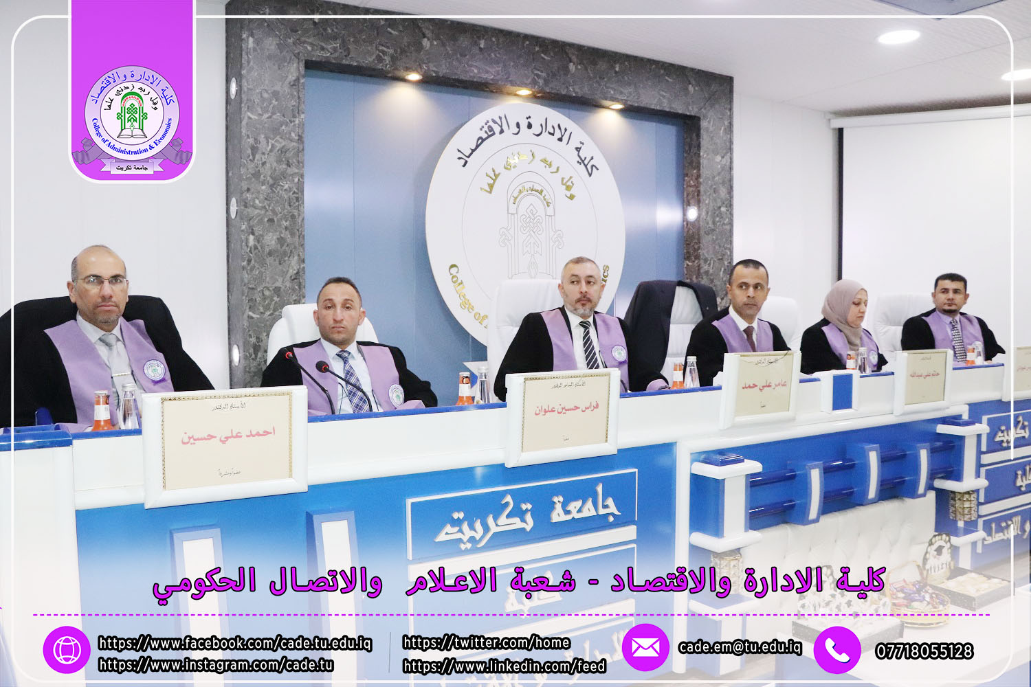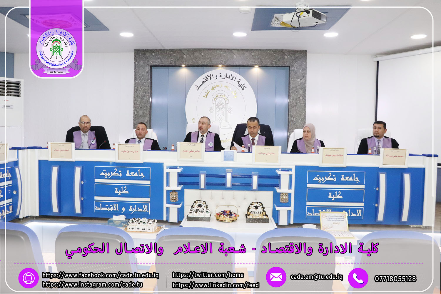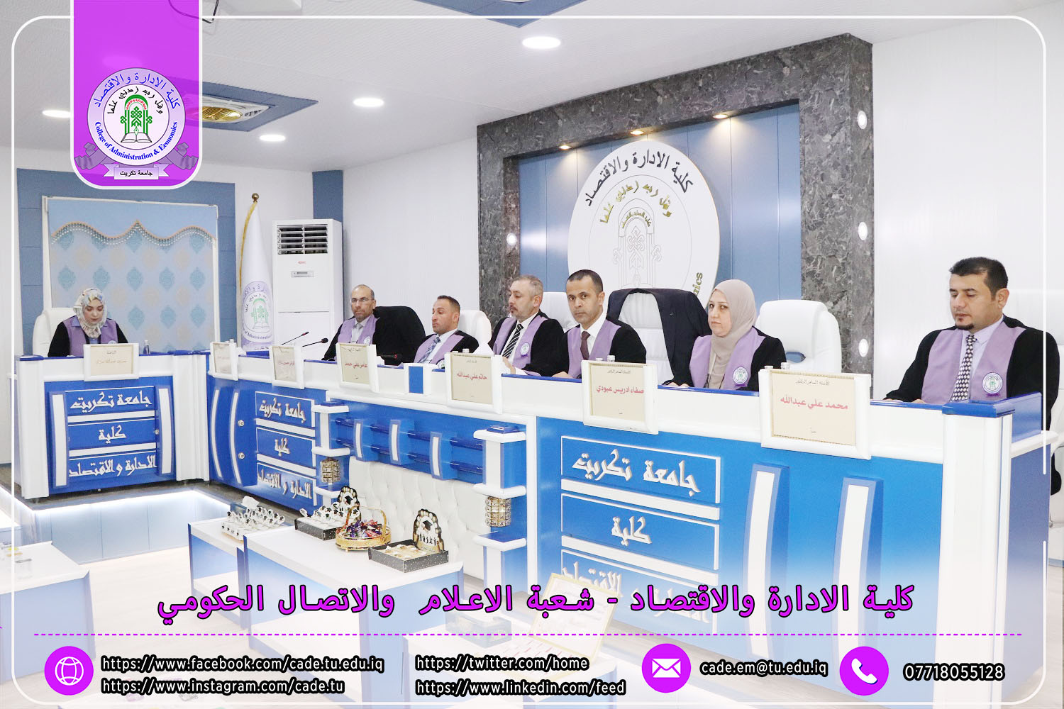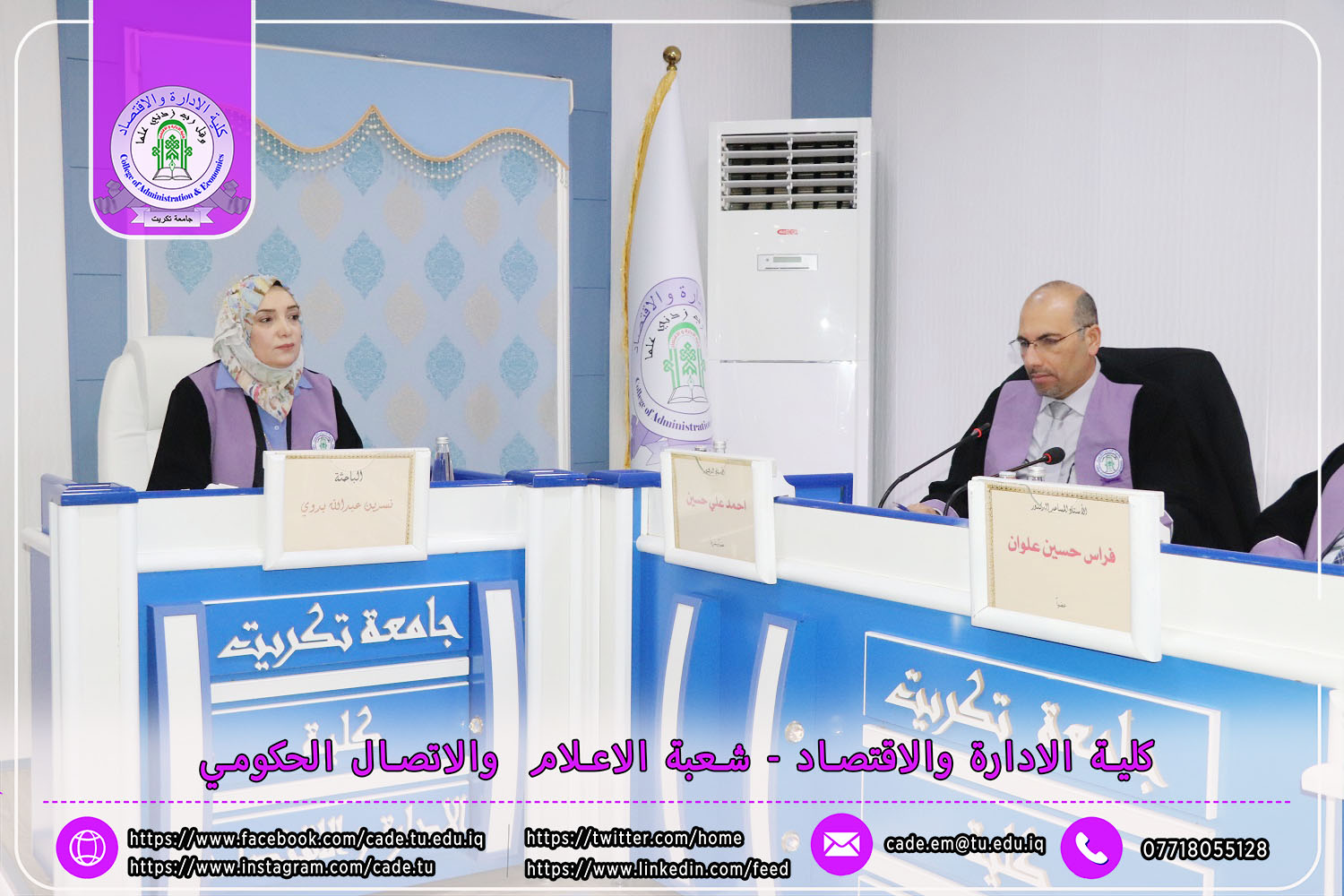 نوقشت في كلية الإدارة والاقتصاد / قسم ادارة الاعمال / أطروحة دكتوراه في العلوم الإدارية للطالــبة نسرين عبدالله بدوي الموسومة ((اثر سلوكيات القيادة الشاملة في الصمود النفسي الدور التفاعلي لشغف العمل/ دراسة تحليلية لآراء عينة من الملاكات التدريسية في جامعة تكريت)) بأشراف ا.د. احمد علي حســــــــين.
