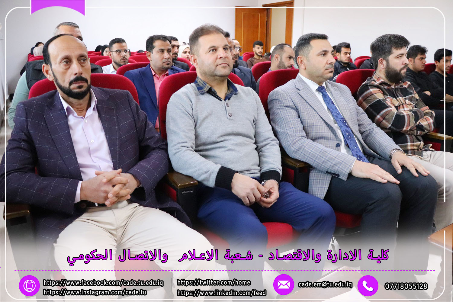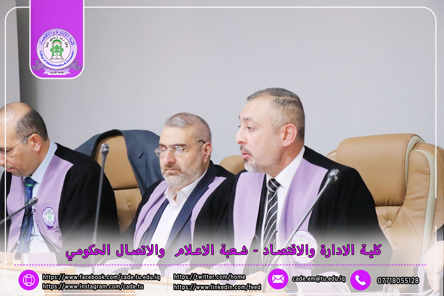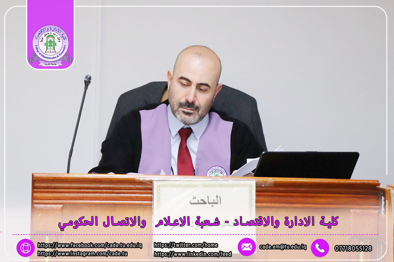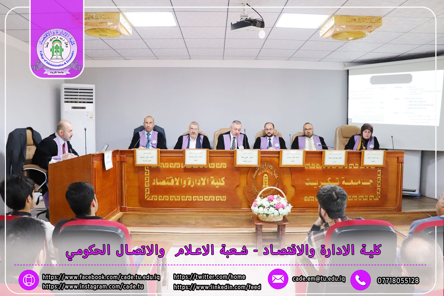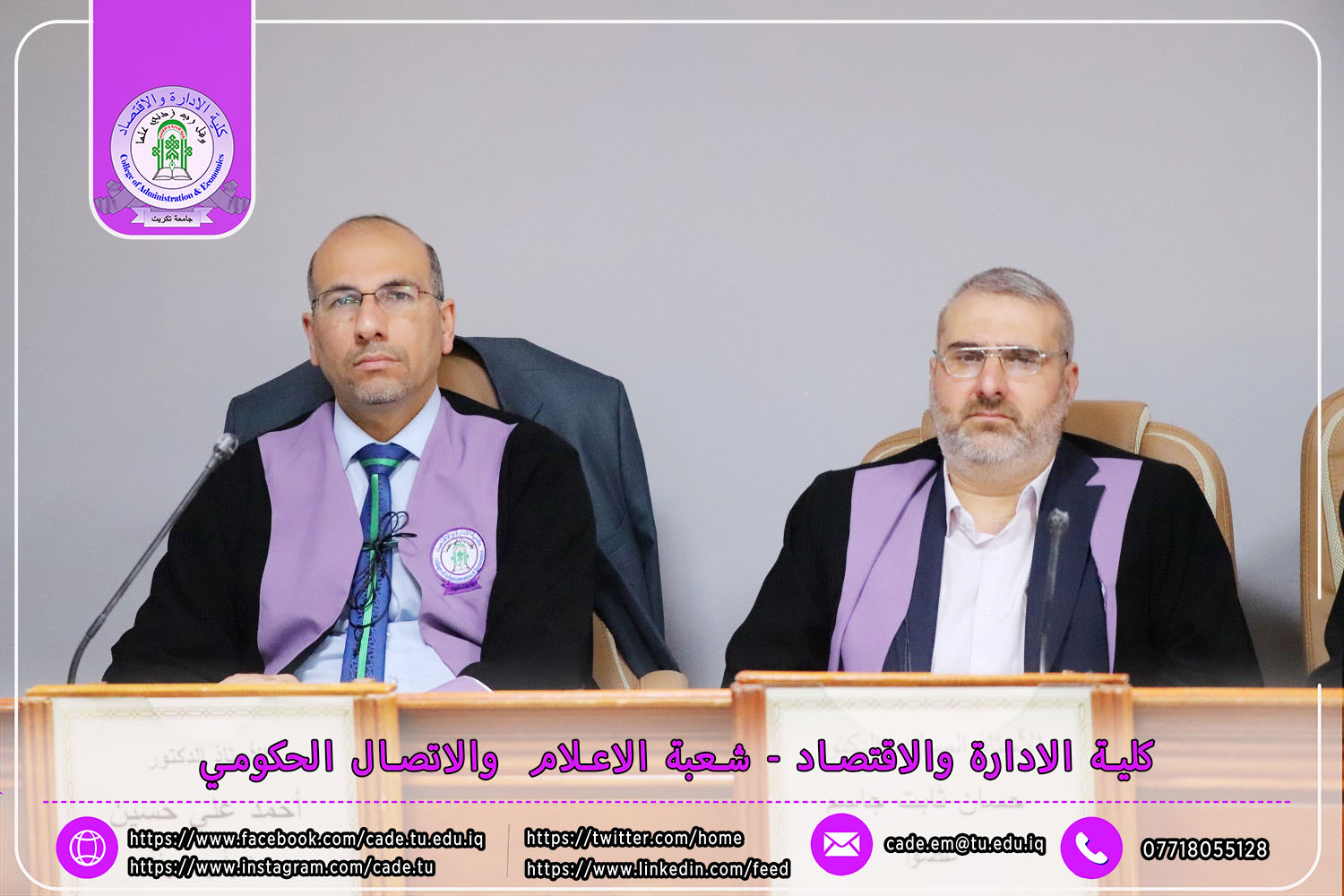 هذا وقد حضر المناقشة ا.م.د. فؤاد فرحان حسين عميد كلية الإدارة والاقتصاد وا.م.د. فراس فرحان جدي رئيس قسم ادارة التسويق ا.م.د. حاضر صباح شعير رئيس قسم الإدارة العامة وعدد من السادة التدريسين وطلبة الدراسات العليا.