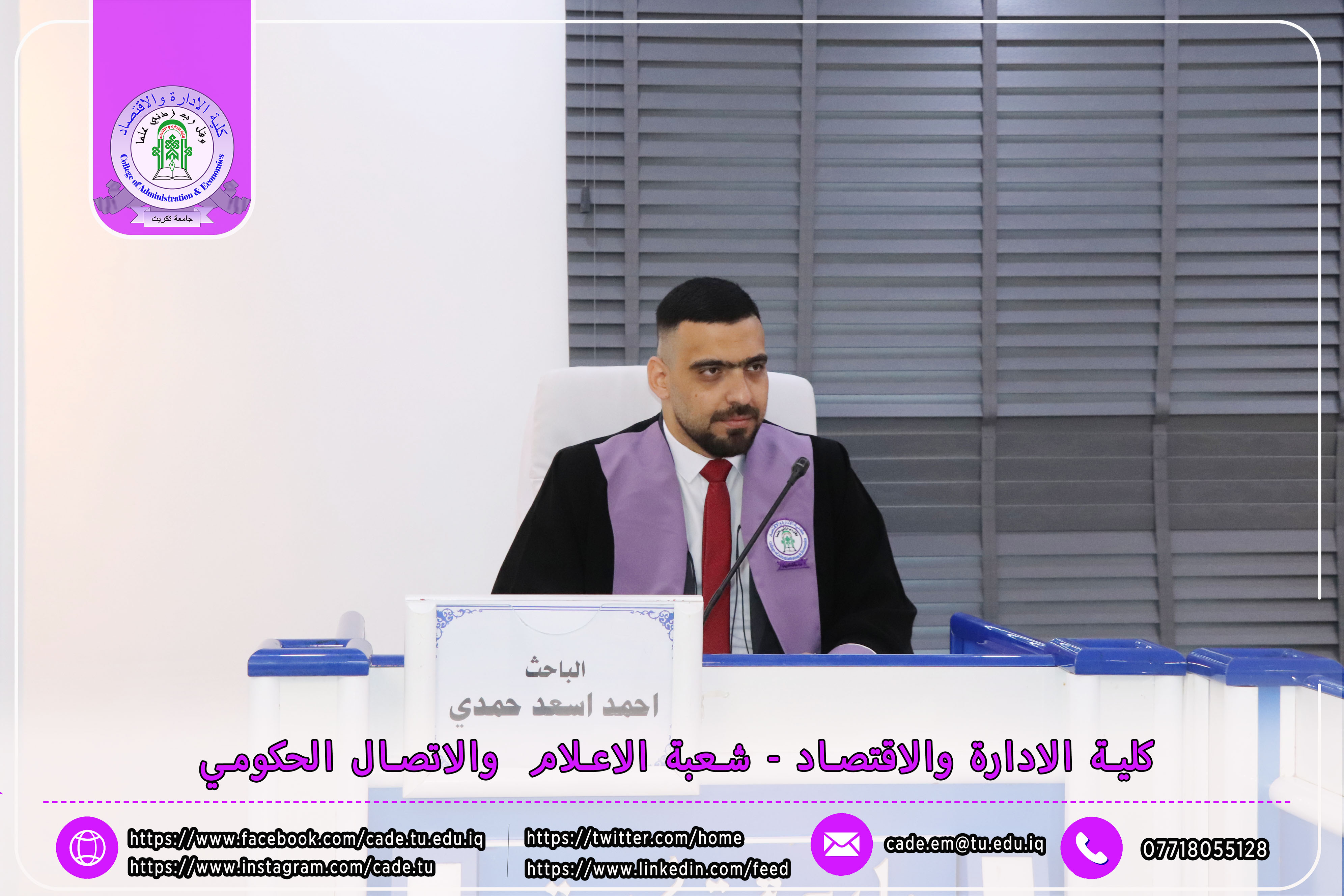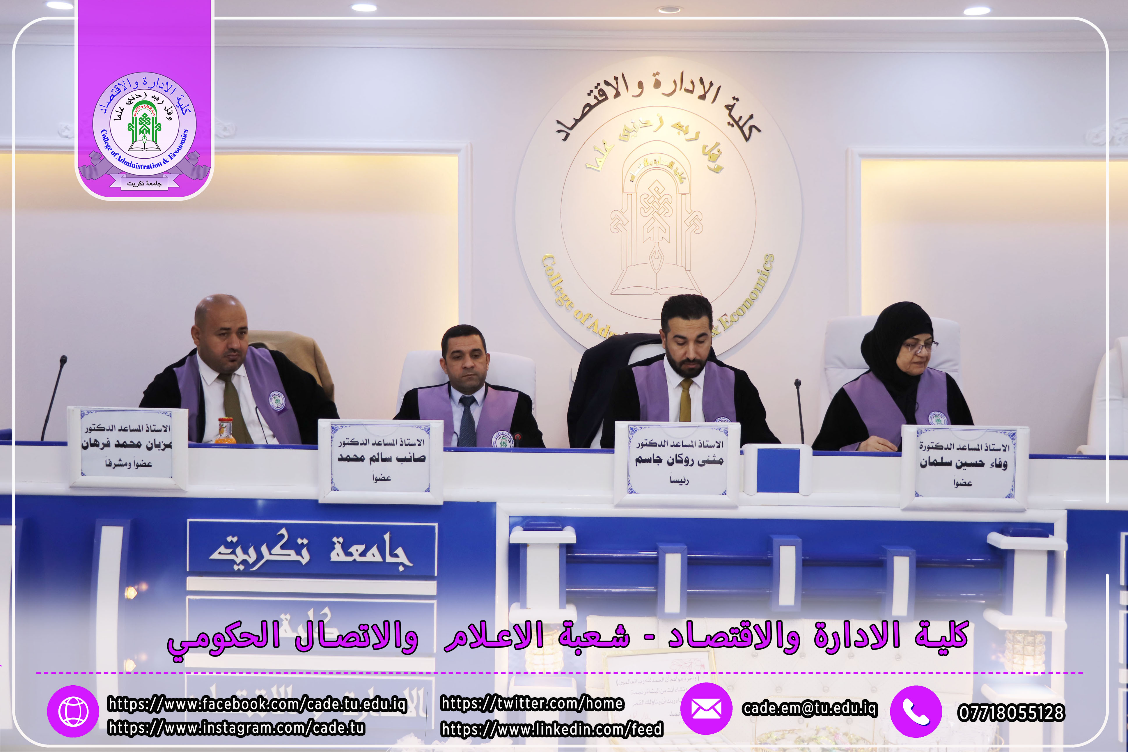 هذا وقد حضر المناقشة ا.م.د. فؤاد فرحان حسين عميد كلية الإدارة والاقتصاد و ا.م.د. اشرف هاشم فارس وعدد من طلبة الدراسات العليا.