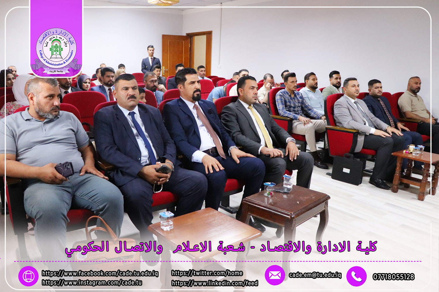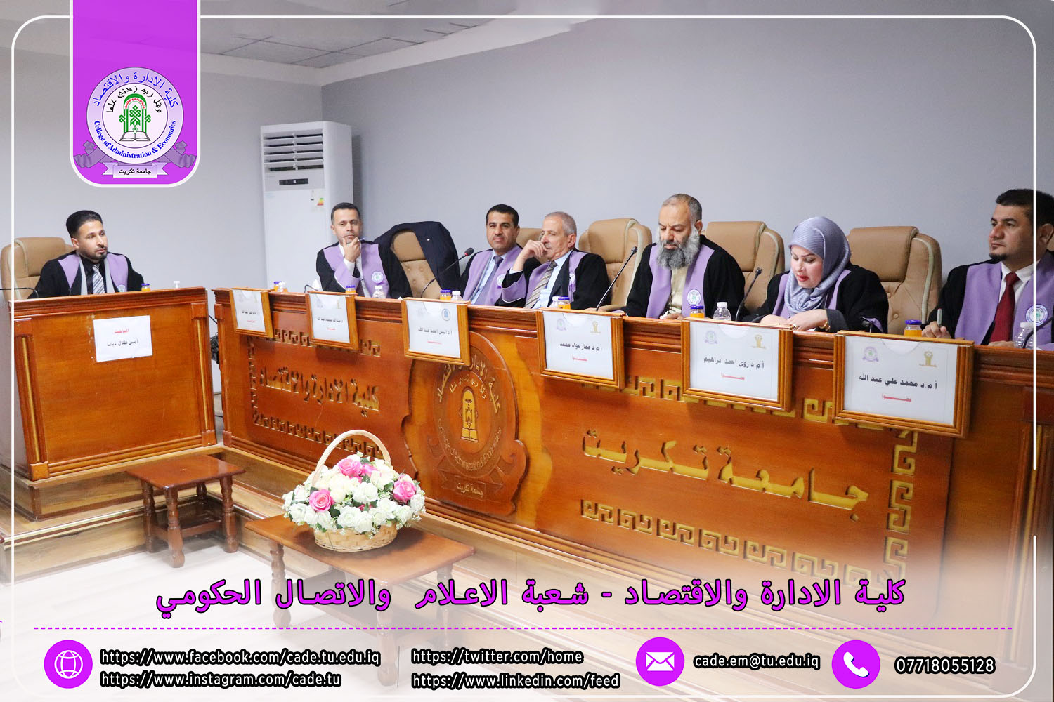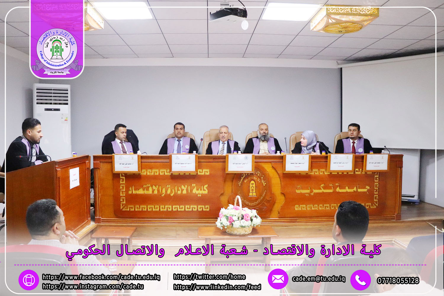 وقد شهدت المناقشة حضور الأستاذ المساعد الدكتور فؤاد فرحان حسين، عميد كلية الإدارة والاقتصاد، والدكتور قتيبة إبراهيم حمادة معاون العميد لشؤون الطلبة، إلى جانب نخبة من السادة التدريسيين وعدد من طلبة الدراسات العليا.