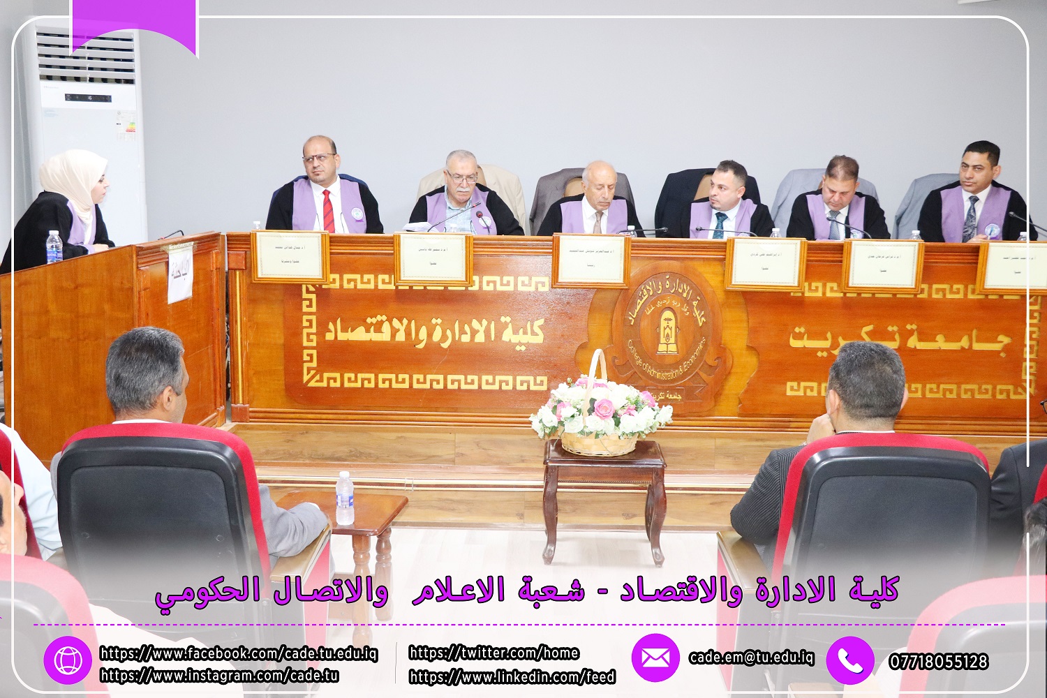 نوقشت في كلية الإدارة والاقتصاد / قسم إدارة الاعمال / أطروحة الدكتوراه فلسفة في العلوم الادارية للطالبة كوثر عبدالجبار حسين الموسومة (الذكاء المالي مدخل لتحقيق الاستدامة المالية في اطار نموذج PATROL : دراسة تطبيقية لعدد من المصارف التجارية العراقية الخاصة) وذلك بأشراف ا.د. جمال هداش محمد.