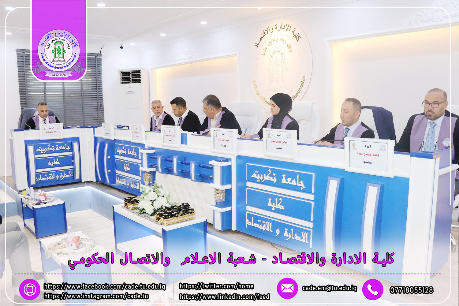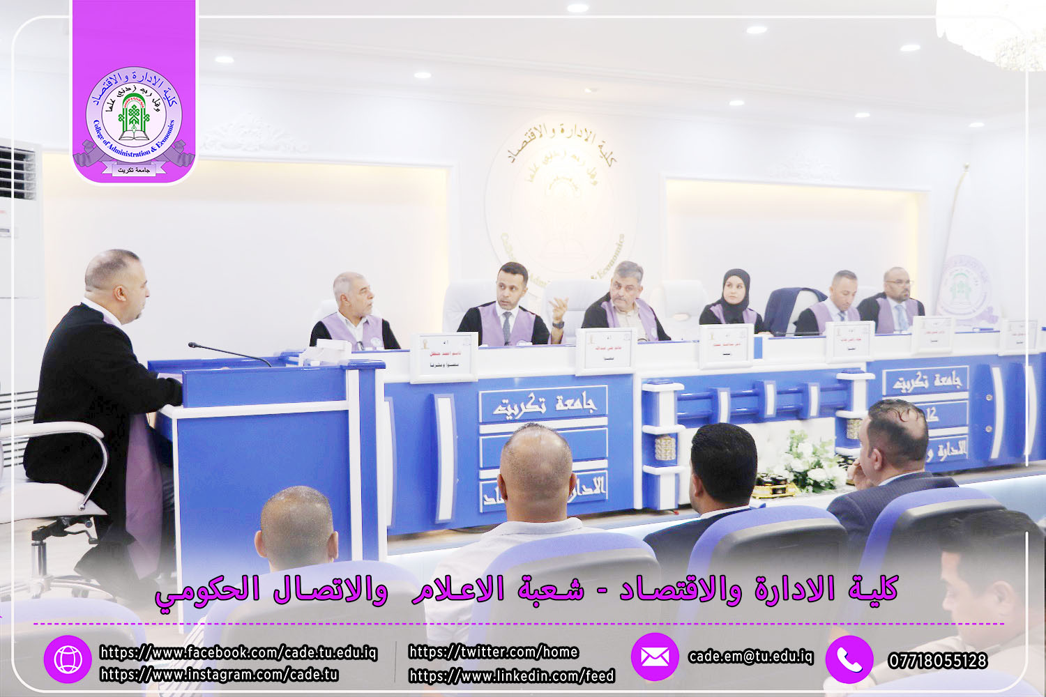 نوقشت في كلية الإدارة والاقتصاد / قسم ادارة الاعمال / أطروحة الدكتوراه في العلوم الإدارية للطالــب سعد سالم غانم الموسومة (تحليل واقع البرامج الاكاديمية للدراسات العليا وفق بنود المواصفة الدولية الايزو 2018- 21001/ دراسة حالة لعدد من كليات جامعة تكريت) بأشراف ا.د. قاسم احمد حنظل.