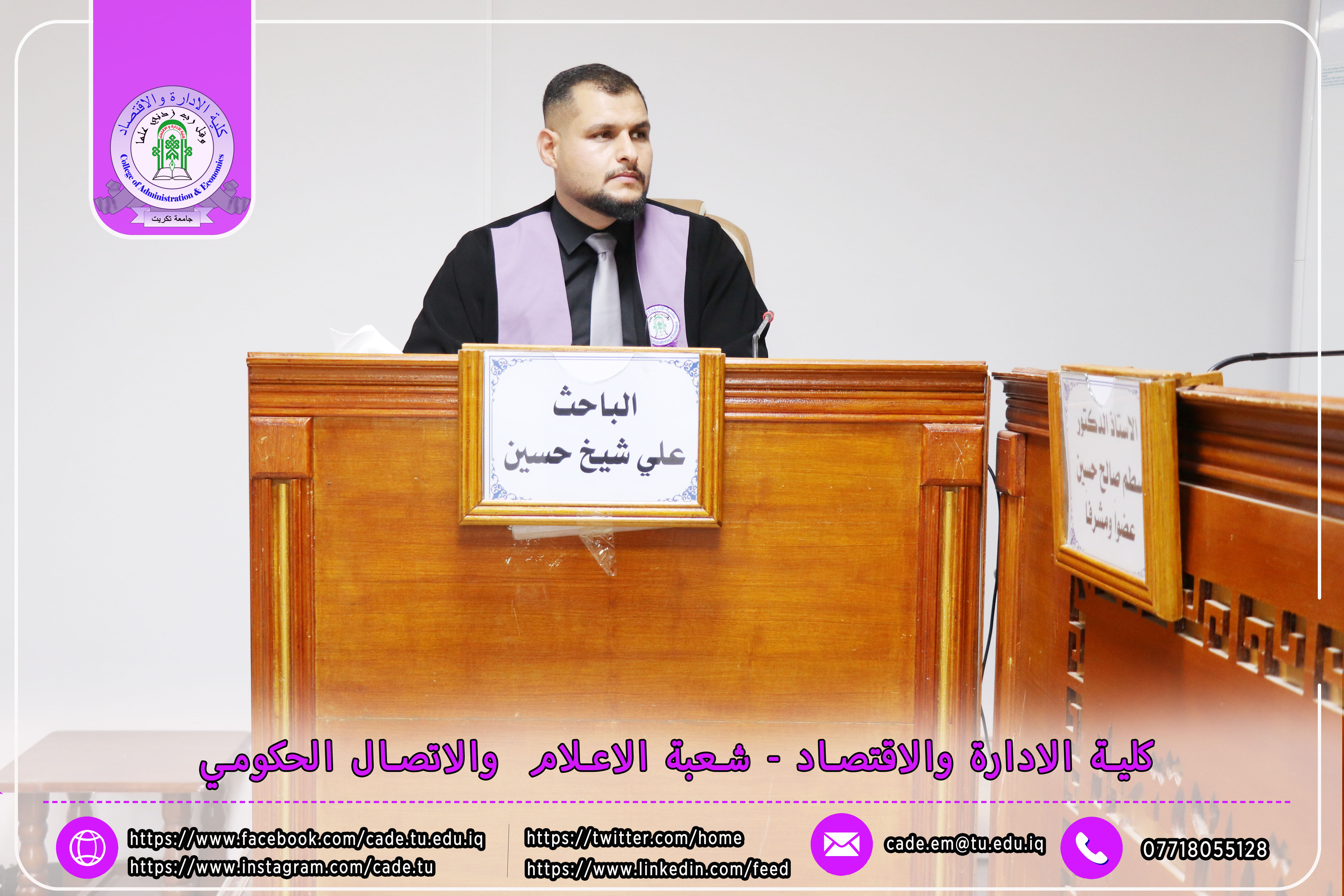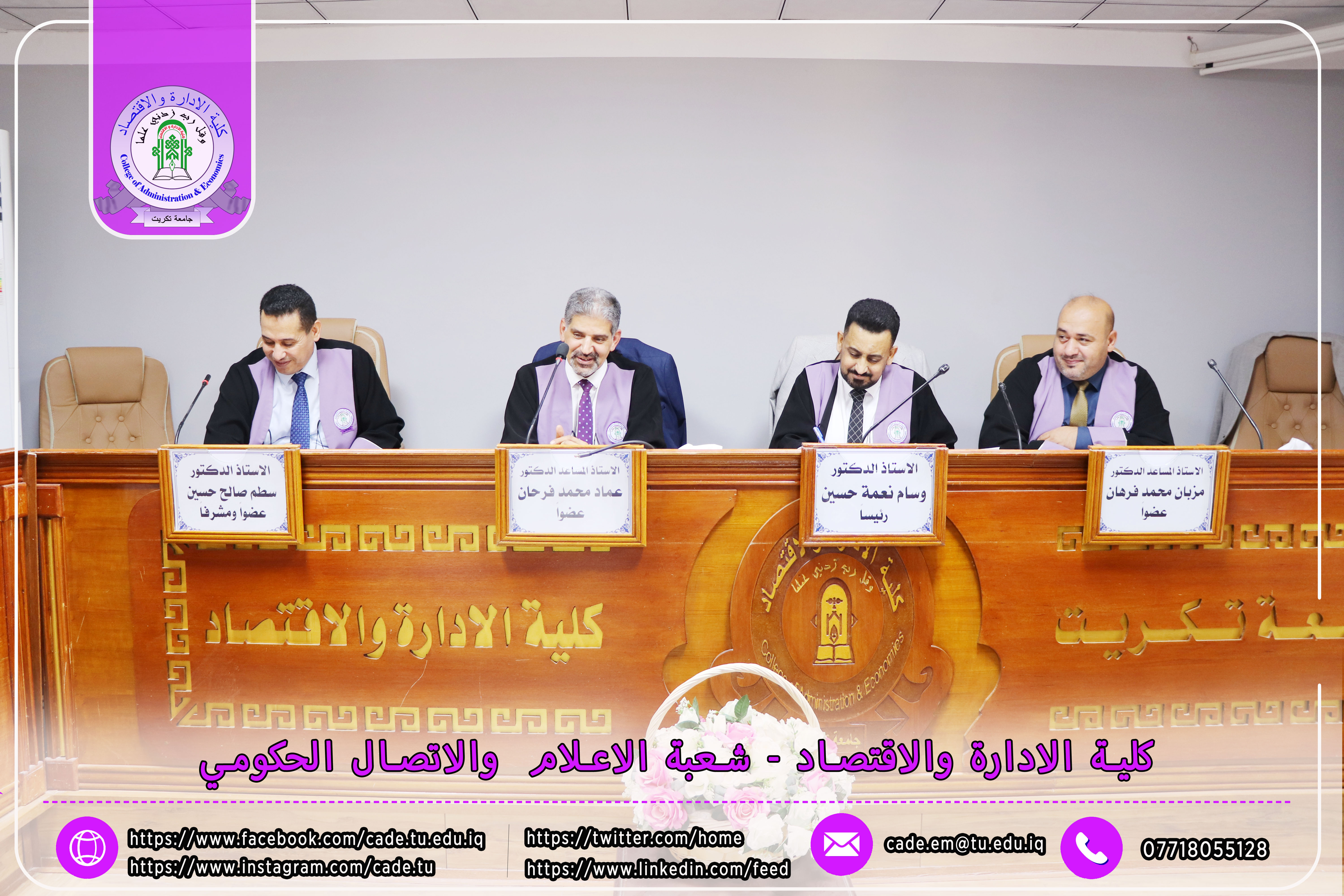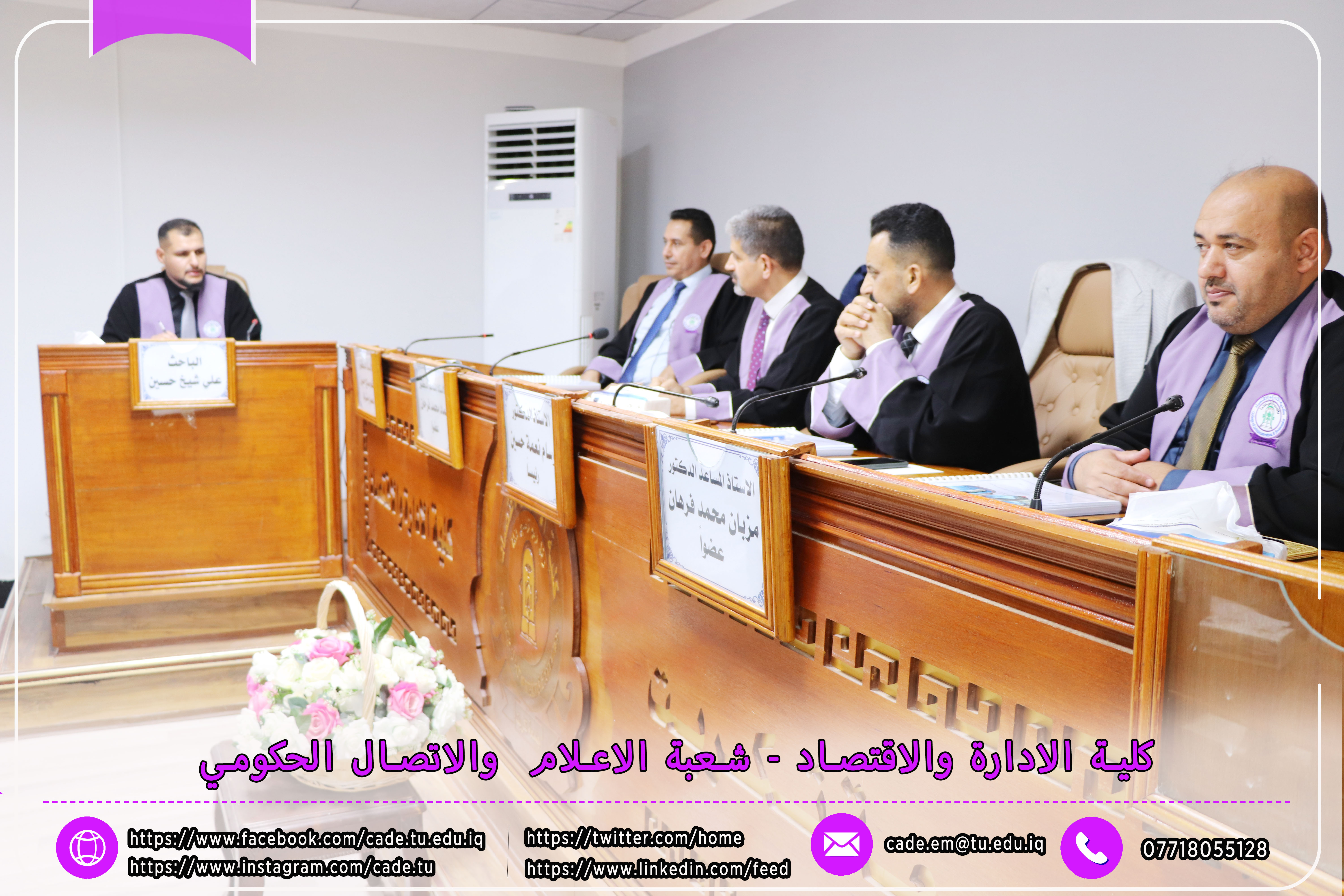هذا وقد حضر المناقشة ا.م.د. فؤاد فرحان حسين عميد كلية الإدارة والاقتصاد إلى جانب عدد من السادة التدريسيين وطلبة الدراسات العليا.