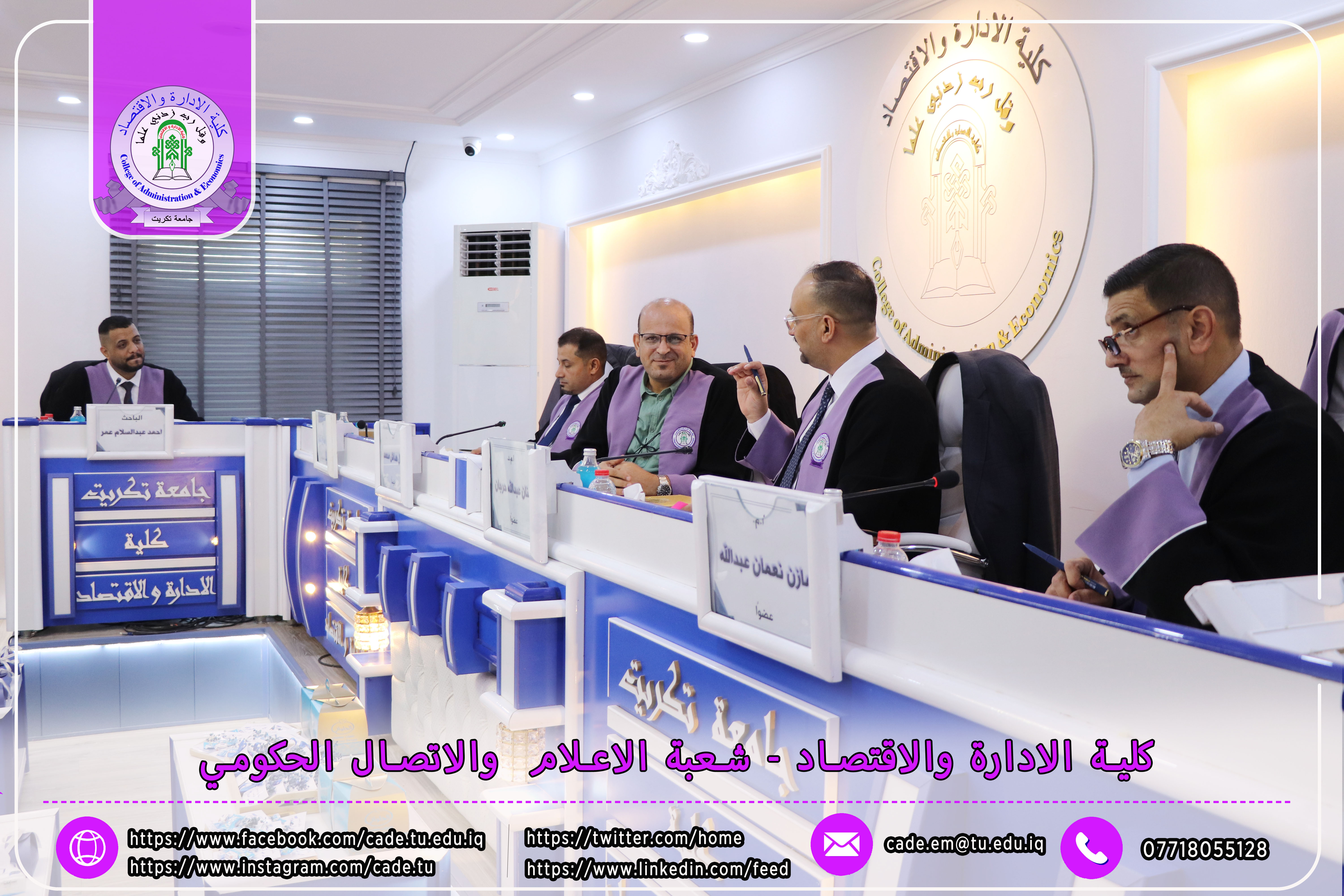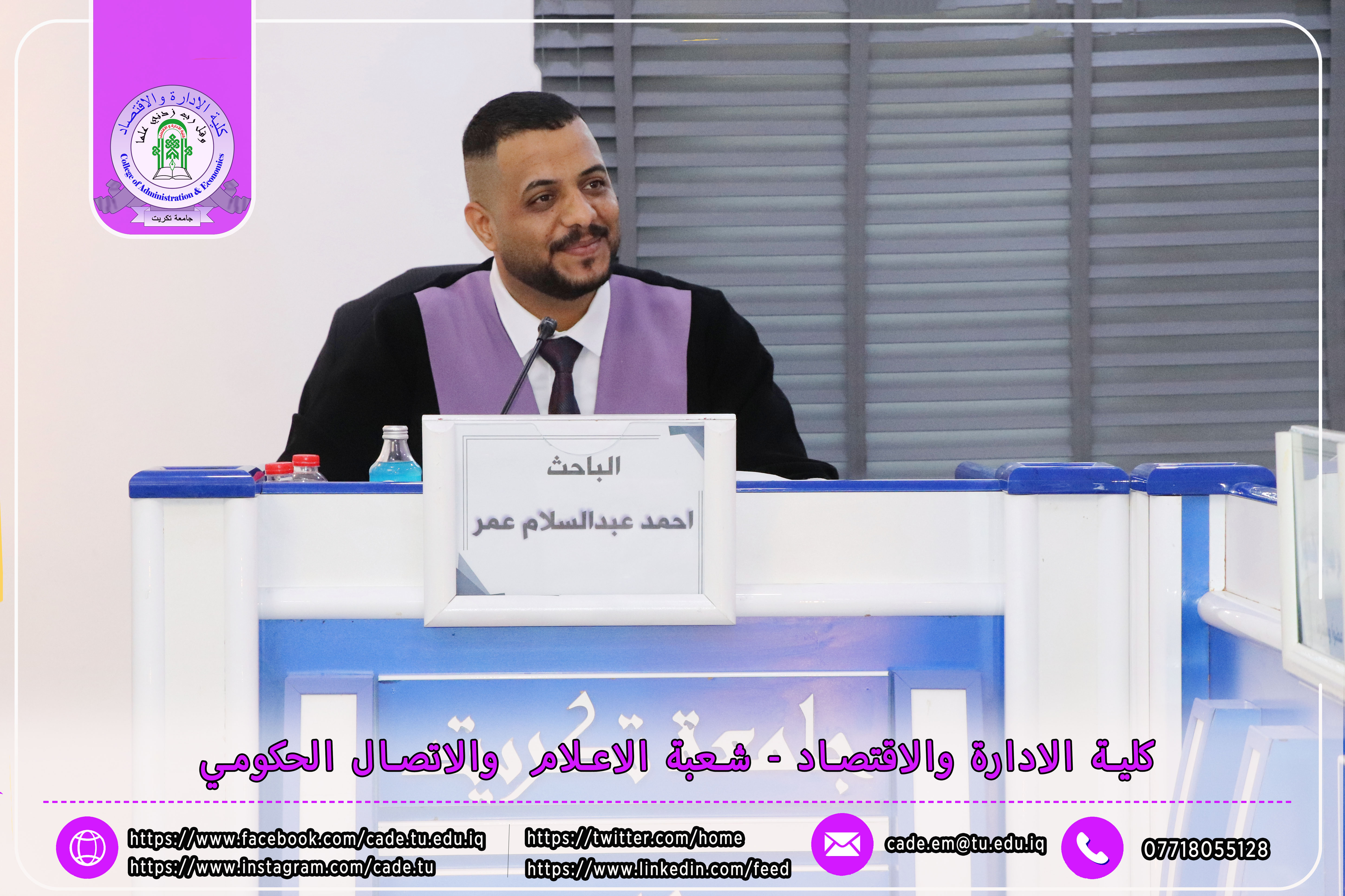 نوقشت في كلية الإدارة والاقتصاد رسالة في العلوم المالية والمصرفية للطالب احمد عبد السلام عمر الموسومة ( تأثير الذكاء المالي في تحقيق الاستقرار المصرفي_ دراسة في عينة من المصارف العراقية) بأشراف ا.م. حاضر صباح شعير.