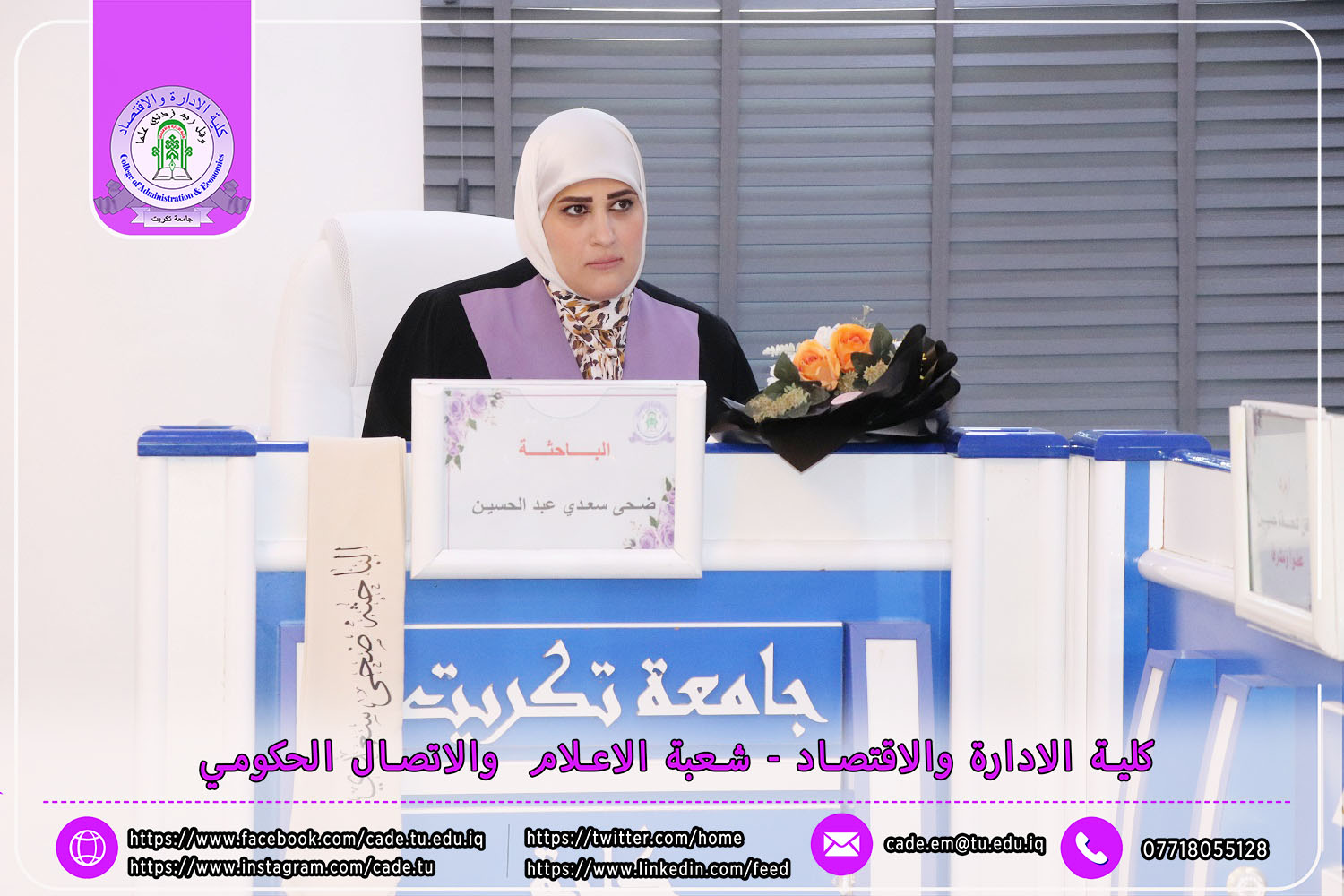 نوقشت في كلية الإدارة والاقتصاد/ قسم ادارة الاعمال / رسالة الماجستير في العلوم الإدارية للطالبة ضحى سعدي عبدالحسين الموسومة (القيادة السخية ودورها في تعدين الموارد البشرية: دراسة تحليلية في جامعة سامراء ) بأشراف ا.م.د. رياض شحاذة حسين.