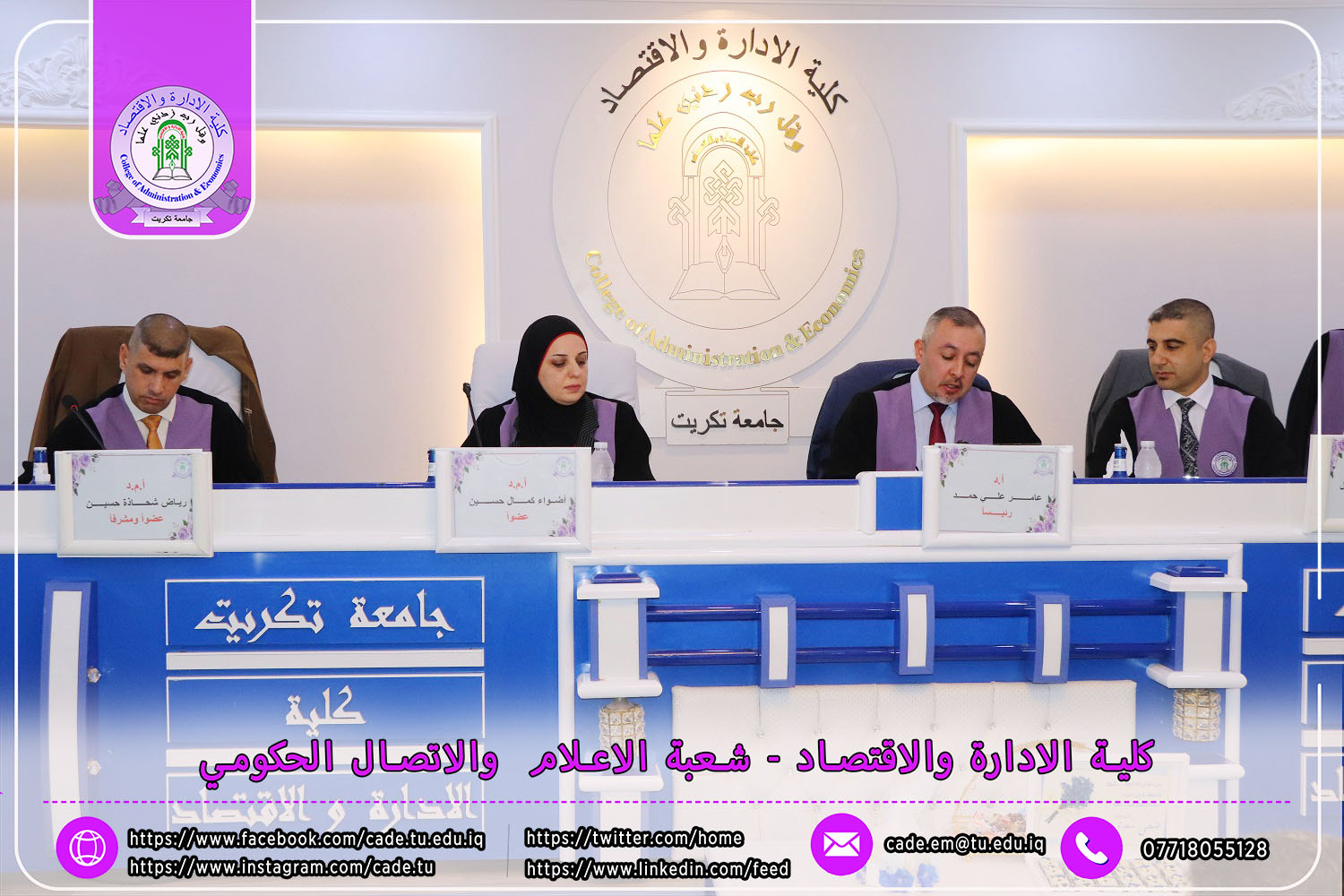 وحضر المناقشة كلٌّ من أ.م.د. فؤاد فرحان حسين عميد كلية الإدارة والاقتصاد، وأ.م.د. خطاب عمران صالح معاون العميد للشؤون العلمية، وم.د. أحمد عايد مخلف معاون العميد للشؤون الإدارية، إضافةً إلى عدد من السادة التدريسيين وطلبة الدراسات العليا."