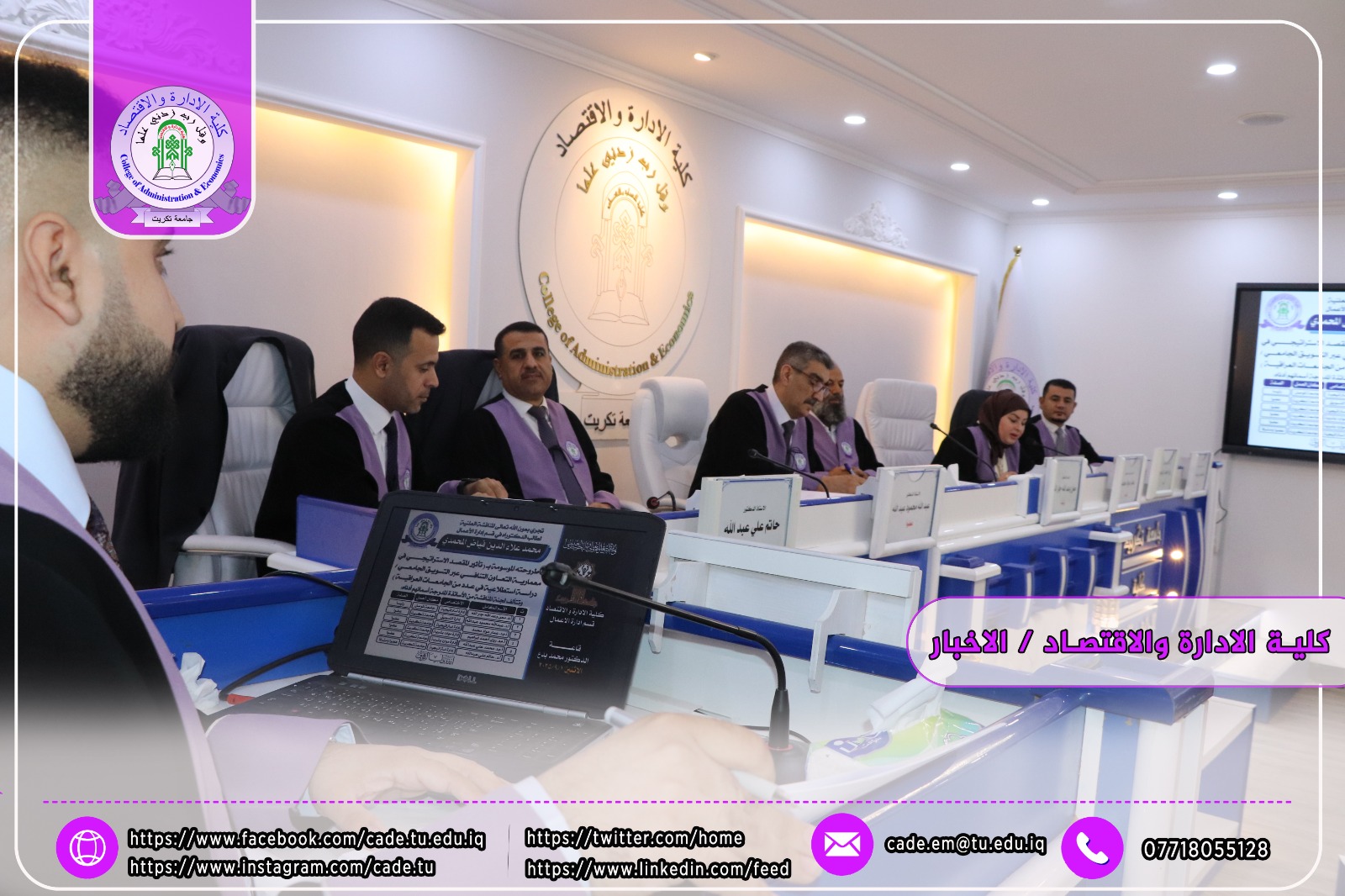 نوقشت في كلية الإدارة والاقتصاد / قسم ادارة الاعمال / أطروحة الدكتوراه في العلوم الإدارية للطالــب محمد علاءالدين فياض الموسومة (تأثير المقصد الاستراتيجي في معمارية التعاون التنافسي عبر التسويق الجامعي/ دراسة استطلاعية في عدد من الجامعات العراقية( بأشراف ا.د. حاتم علي عبدالله