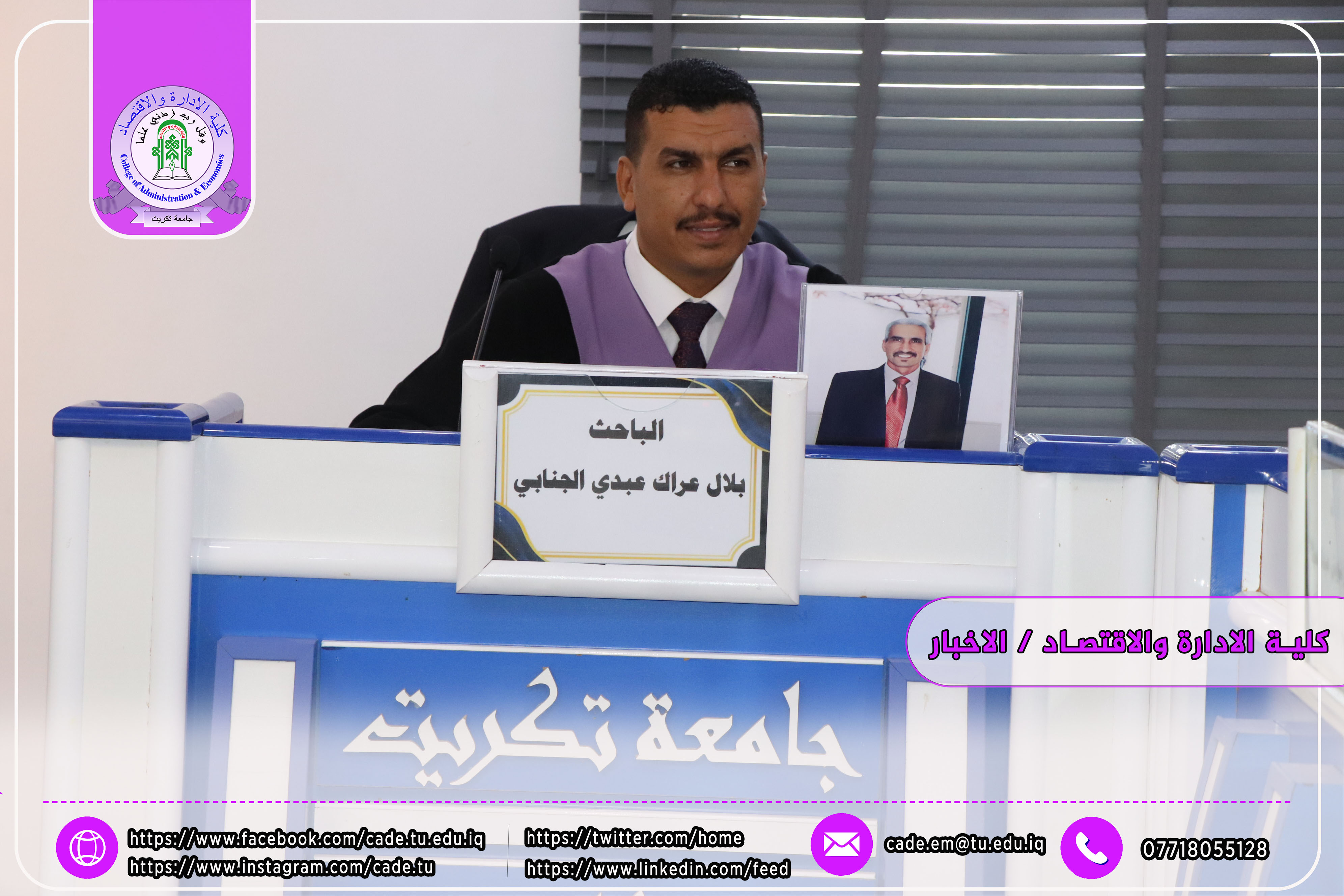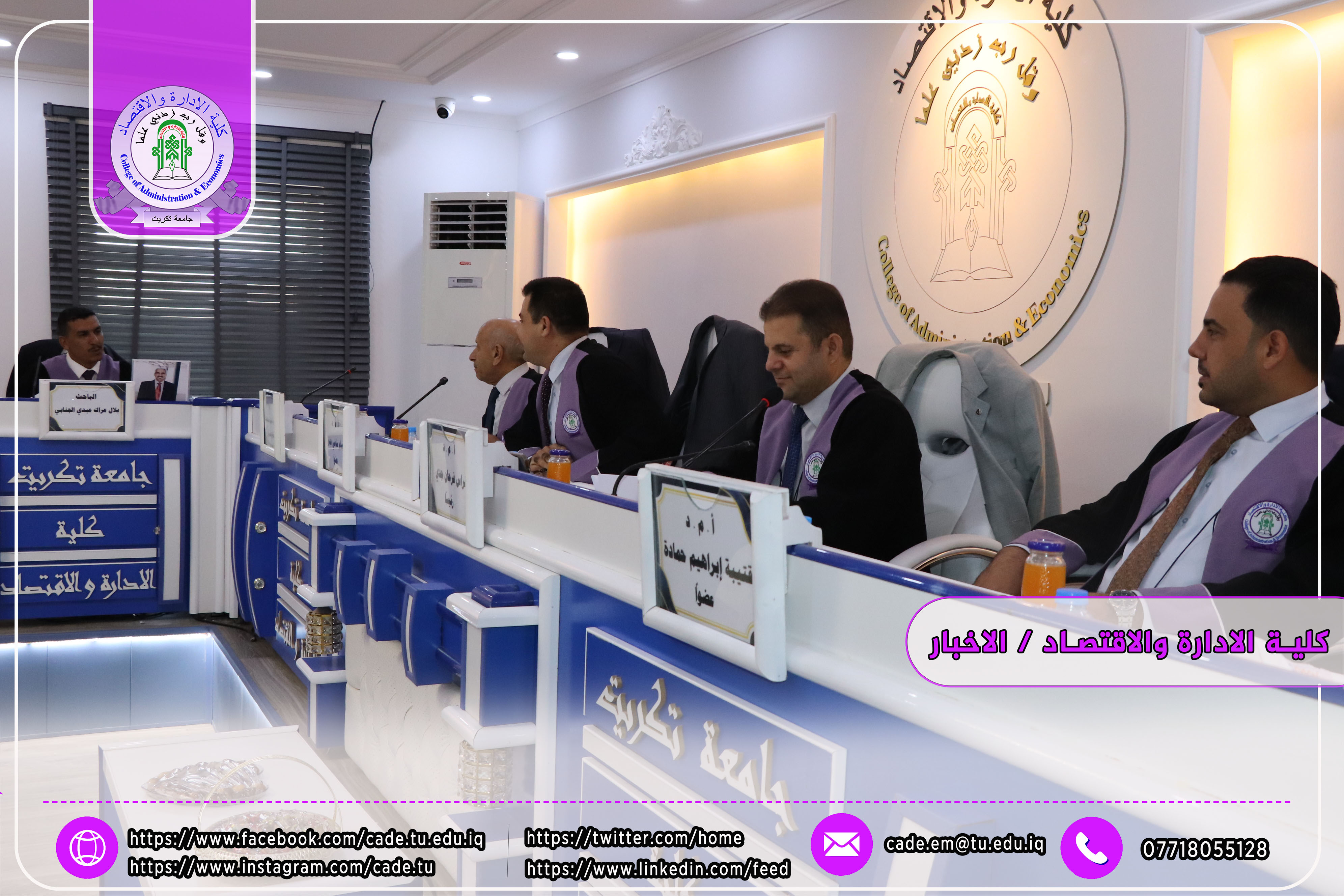 وحضر المناقشة كلٌّ من أ.م.د. فؤاد فرحان حسين عميد كلية الإدارة والاقتصاد، وأ.م.د. خطاب عمران صالح معاون العميد للشؤون العلمية، إضافةً إلى عدد من السادة التدريسيين وطلبة الدراسات العليا.