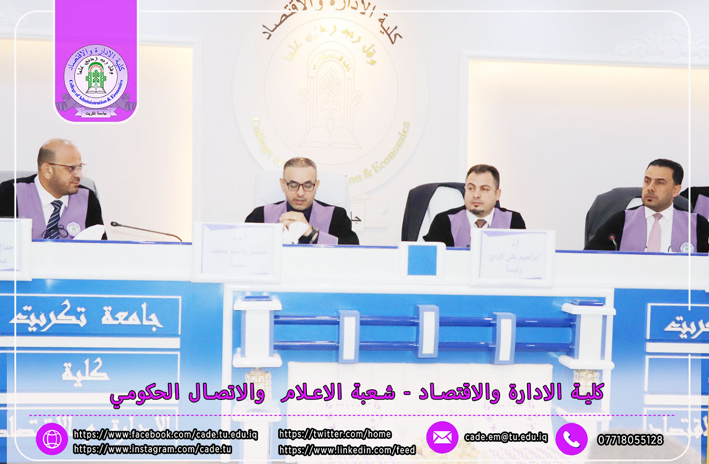 نوقشت في كلية الإدارة والاقتصاد / قسم العلوم المالية والمصرفية/ رسالة الماجستير في العلوم المالية والمصرفية للطالبة مهى خضير احمد الموسومة (تأثير ادارة المخاطر المالية في تقييم الاداء المالي للمصارف: دراسة تطبيقية لعدد من المصارف التجارية العراقية) وذلك بأشراف ا.د. جمال هداش محمد.