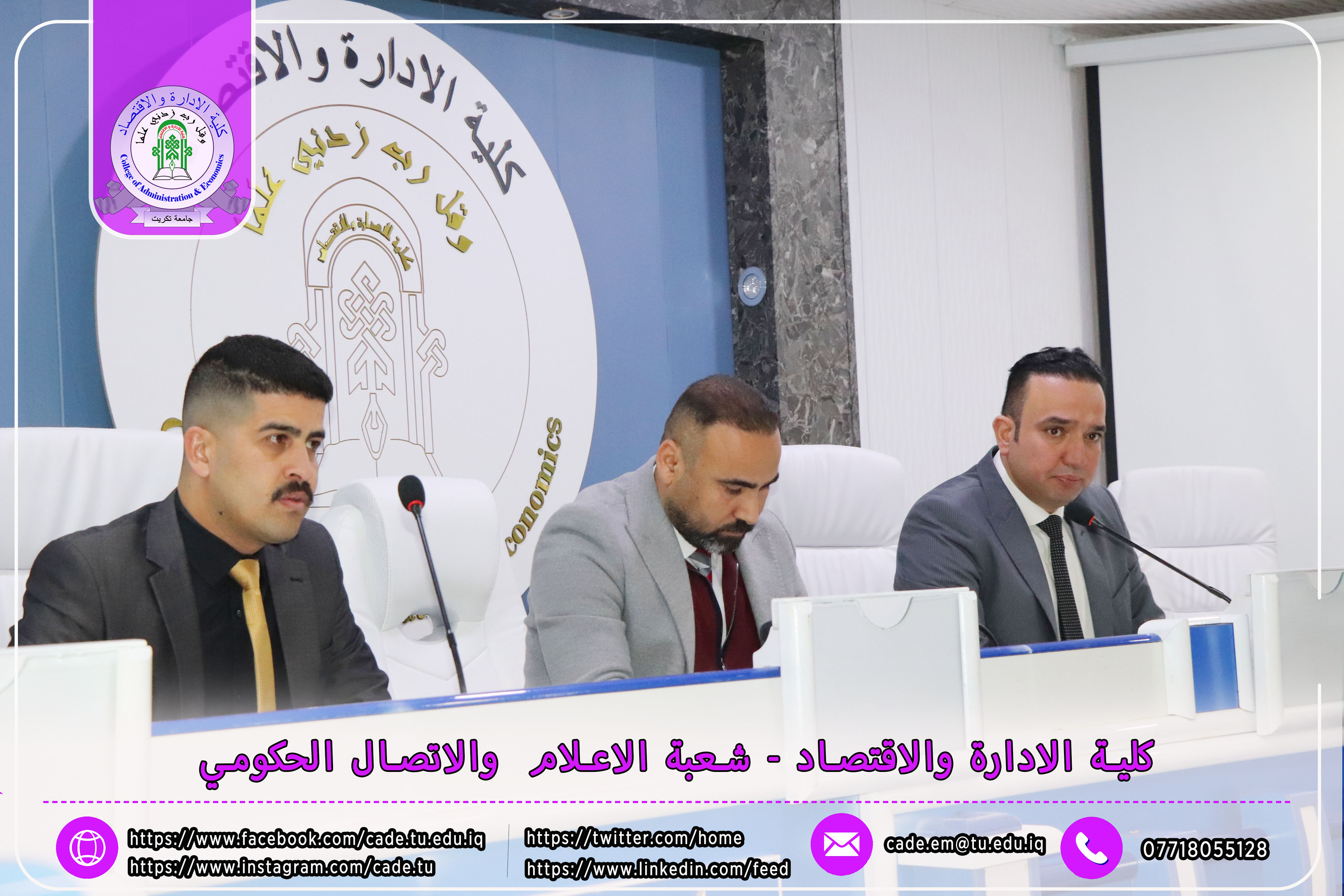 برعاية الأستاذ الدكتور وعد محمود رؤوف، رئيس جامعة تكريت، وإشراف الأستاذ الدكتور عبد الرزاق حمد حسين، عميد كلية الإدارة والاقتصاد، نظمت شعبة الشؤون العلمية بالتعاون مع قسم الشؤون العلمية ومركز التعليم المستمر، وذلك يوم الاثنين الموافق 2025/2/24، ندوة علمية حضورية بعنوان "إرشادات ومعلومات حول قانون انضباط موظفي الدولة رقم 14 لسنة 1991 المعدل"، على قاعة د. محمد بدع.