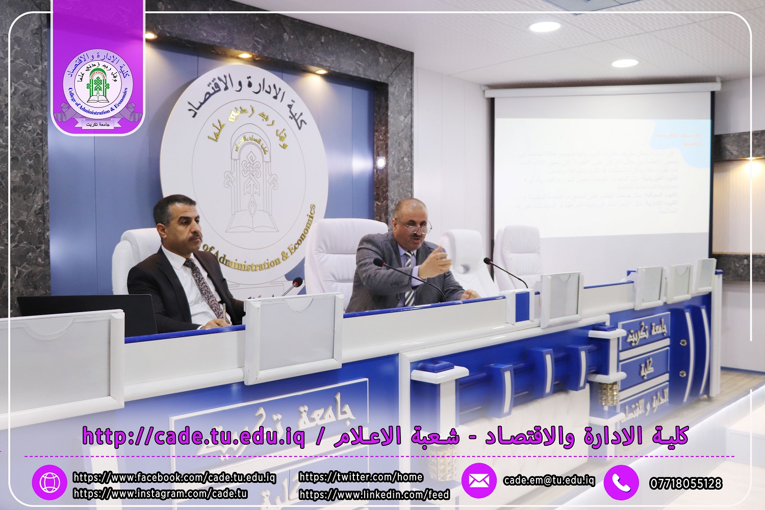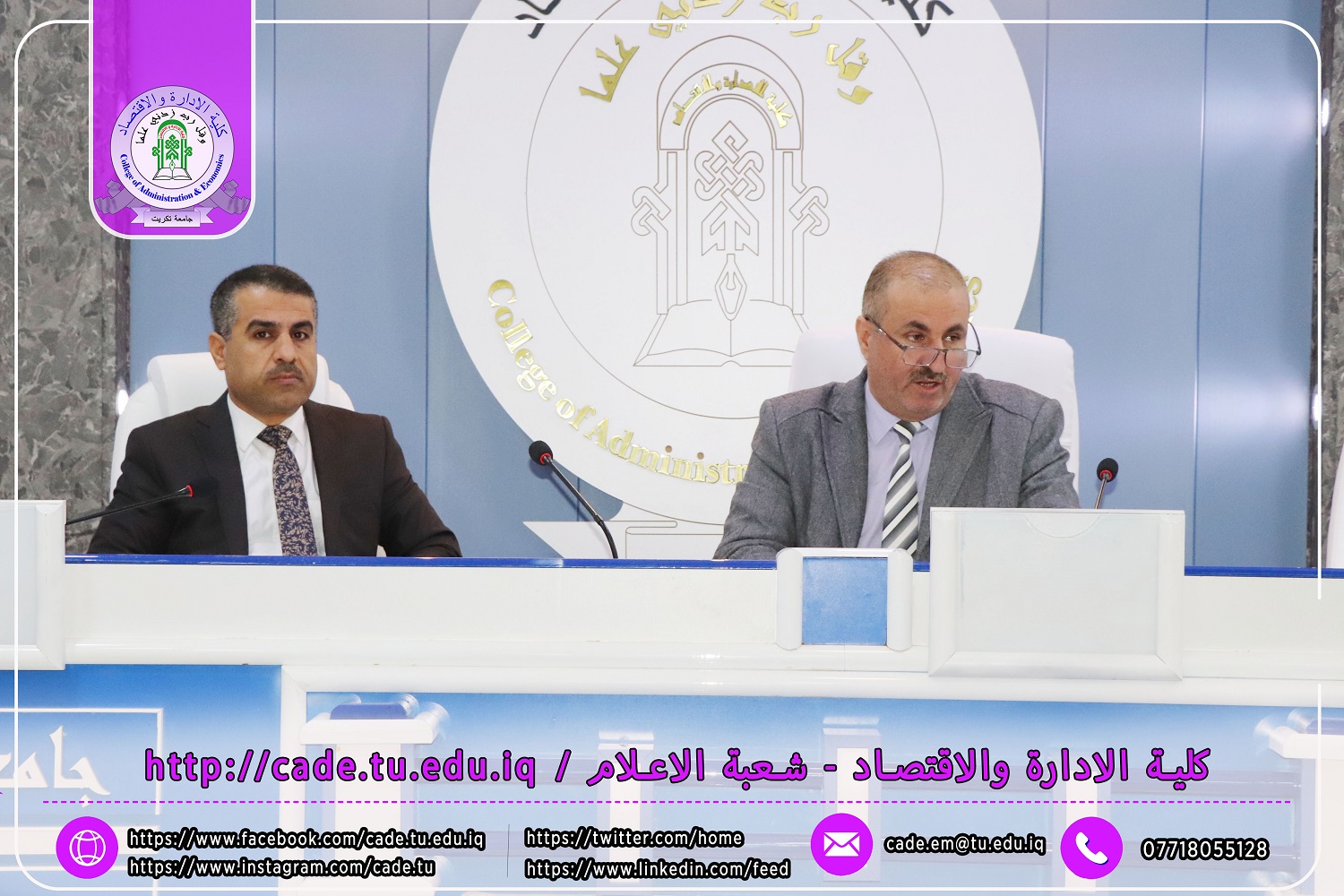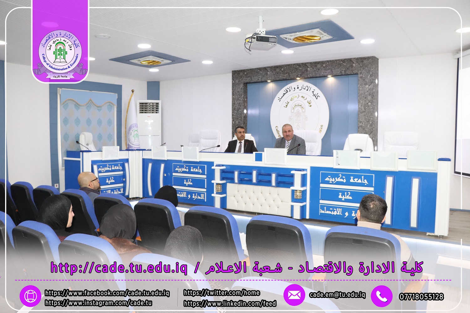 برعاية الأستاذ الدكتور وعد محمود رؤوف، رئيس جامعة تكريت، وإشراف الأستاذ الدكتور عبد الرزاق حمد حسين، عميد كلية الإدارة والاقتصاد، نظم قسم إدارة الأعمال ندوة علمية حضورية بعنوان "القيود الإدارية والتنظيمية في المنظمات الحكومية (مقترحات وحلول)"، وذلك يوم الاثنين الموافق 26 /2/ 2025، على قاعة د. محمد بدع.