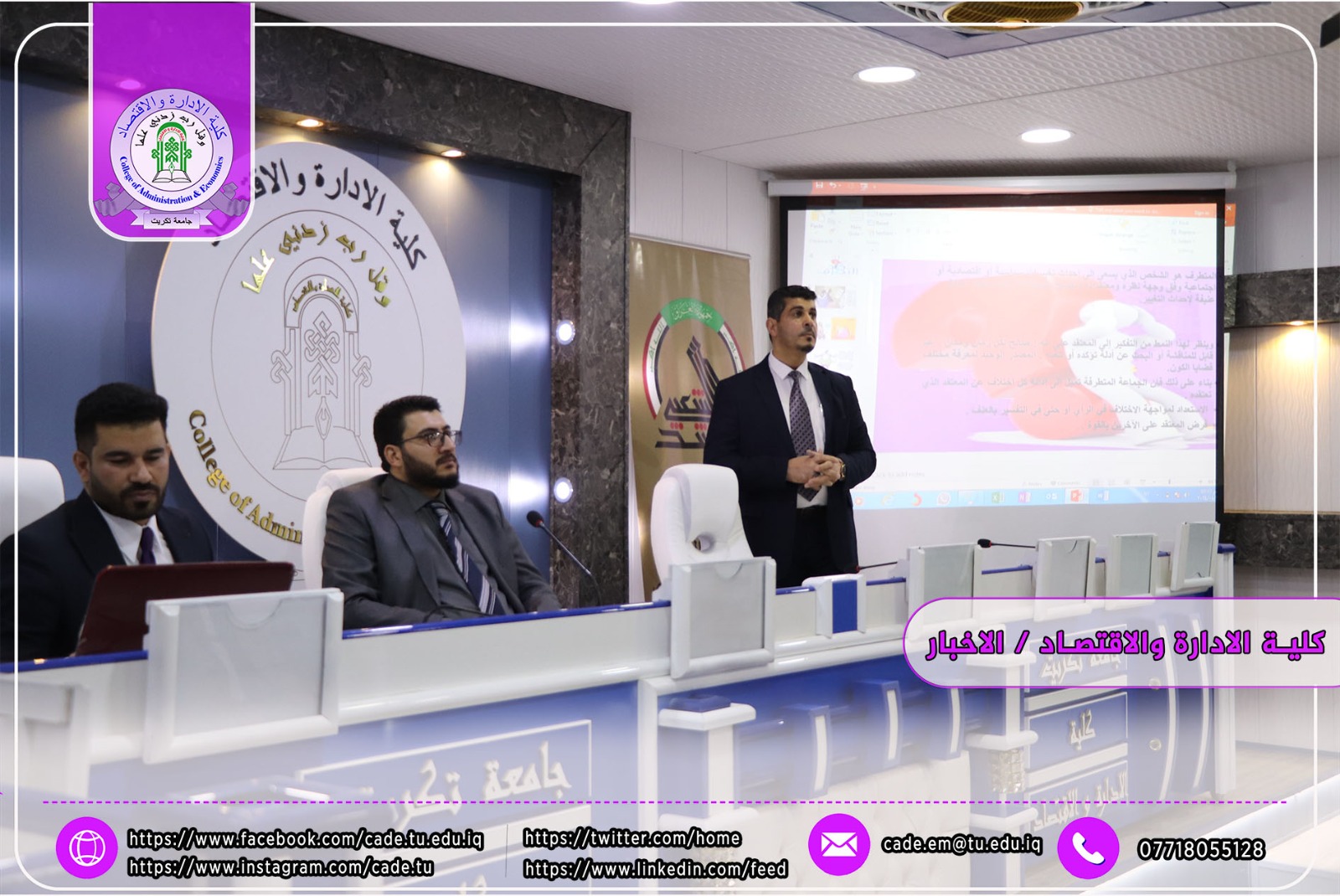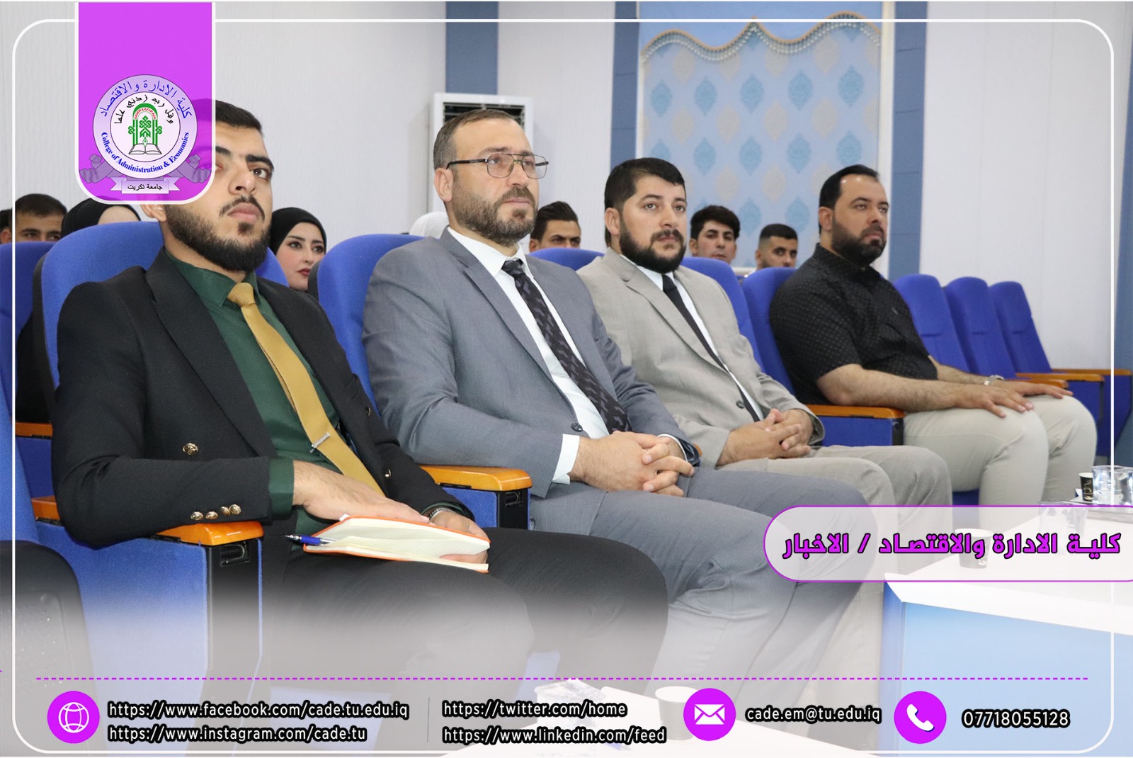 برعاية الاستاذ الدكتور وعد محمود رؤوف رئيس جامعة تكريت وبأشراف العميد الأستاذ الدكتور عبد الرزاق حمد حسين اقامت كلية الإدارة والاقتصاد وبالتعاون مع المديرية العامة لمكافحة الإرهاب الفكري/ مكتب صلاح الدين ندوة علمية بعنوان (ندوة علمية بعنوان العوامل الاجتماعية ودورها في تغذية الفكر المتطرف لدى الشباب) من قبل أ.م. د. قصي جاسم محمد م.م. علي محمد حويد العكيدي السيد علي جادالله علي وذلك يوم الاحد الموافق 2024/4/28 في تمام الساعة العاشرة صباحا على قاعة ا.د. محمد بدع.