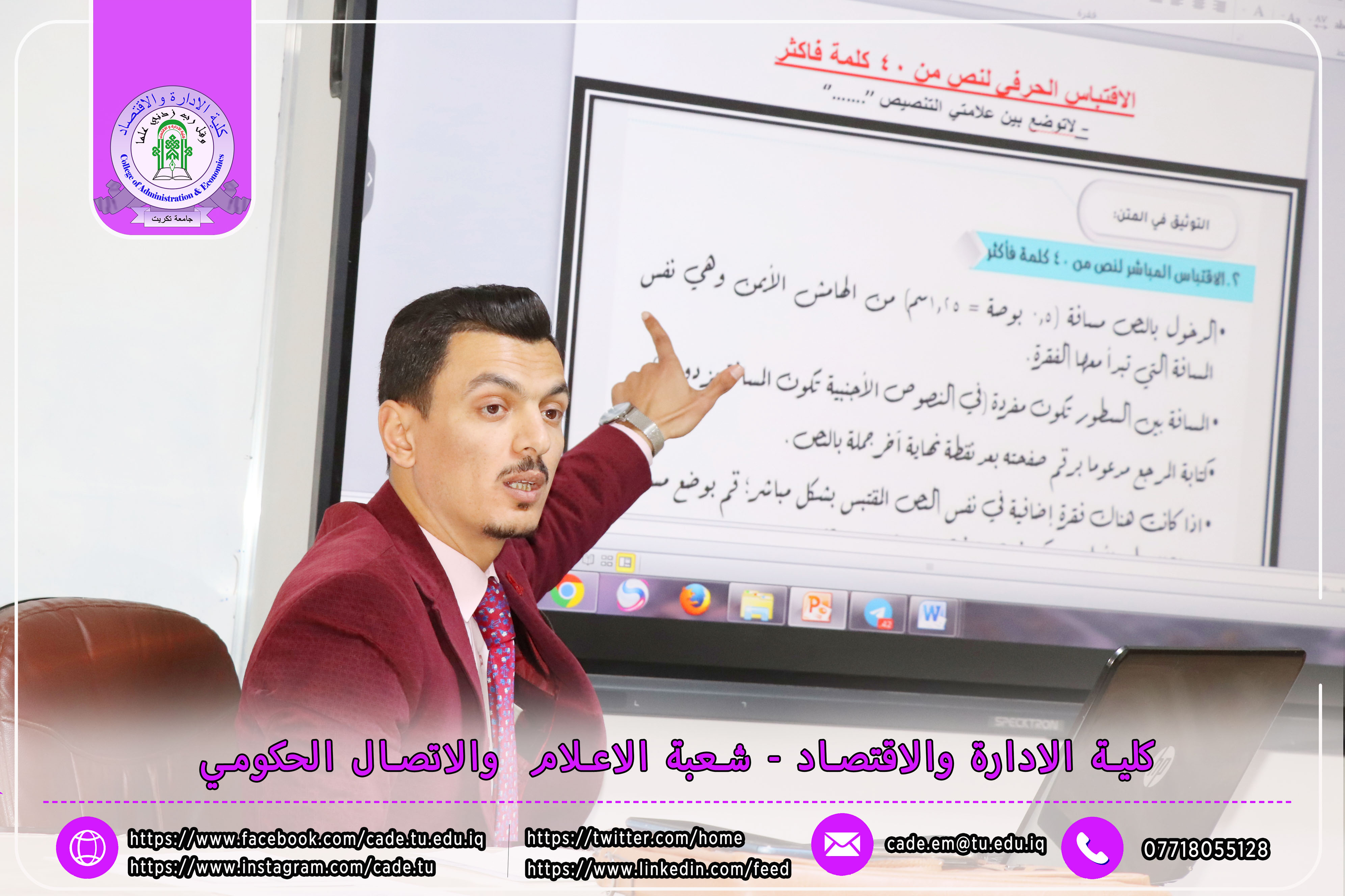 برعاية الأستاذ الدكتور وعد محمود رؤوف، رئيس جامعة تكريت، وإشراف الأستاذ المساعد الدكتور فؤاد فرحان حسين، عميد كلية الإدارة والاقتصاد، نظم قسم إدارة التسويق وبالتعاون مع مركز التعليم المستمر، ورشة عمل بعنوان (( توثيق مراجع البحث العلمي وفق نظام APA7 )) وذلك في يومي الأربعاء والخميس الموافقين 6 و 7 من شهر اذار 2025.