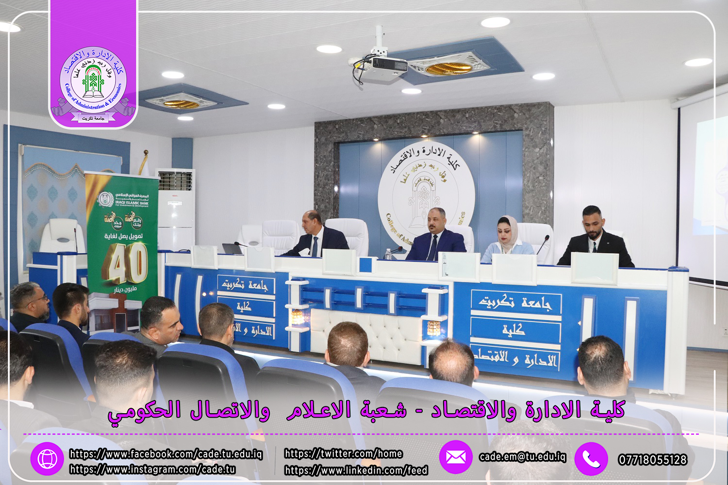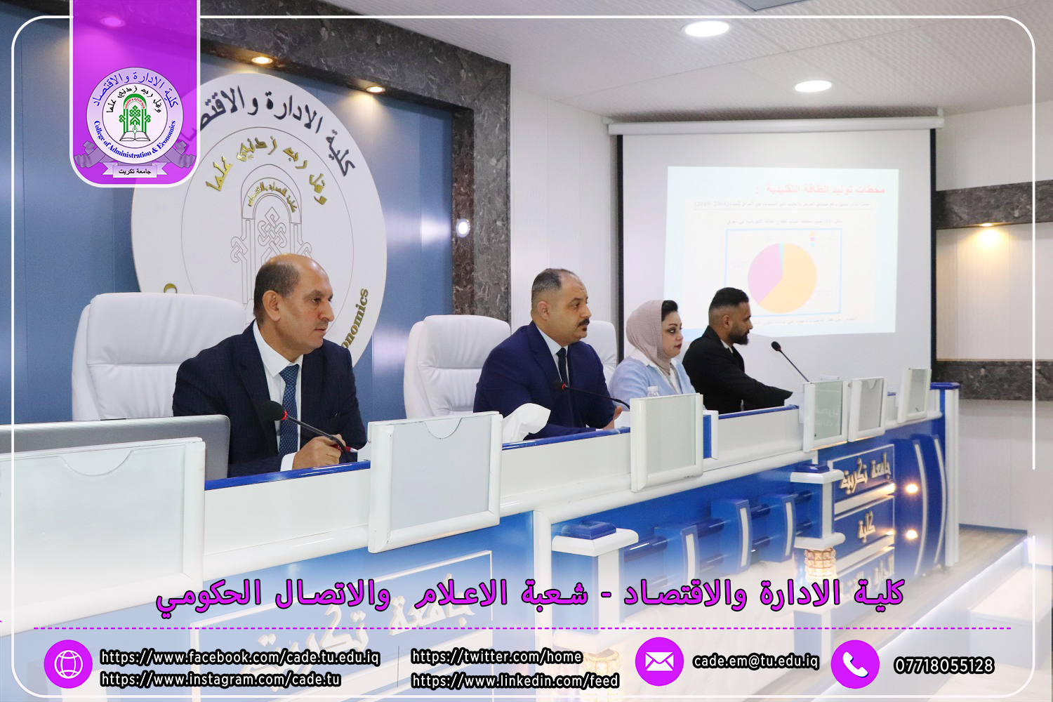 برعاية الأستاذ الدكتور وعد محمود رؤوف، رئيس جامعة تكريت، وإشراف الأستاذ الدكتور عبد الرزاق حمد حسين، عميد كلية الإدارة والاقتصاد، نظمت وحدة التأهيل والتوظيف والمتابعة بالتعاون مع المصرف العراقي الإسلامي للاستثمار والتنمية، يوم الثلاثاء الموافق 3/12/2024، ندوة علمية حضورية بعنوان "أهمية تمويل مشاريع الطاقة الشمسية"، وذلك في قاعة د. محمد بدع.