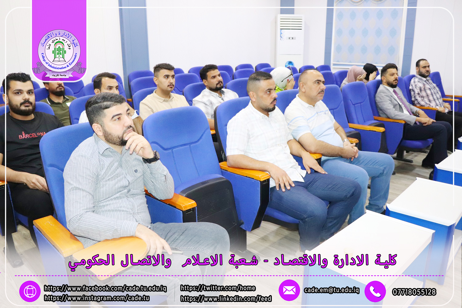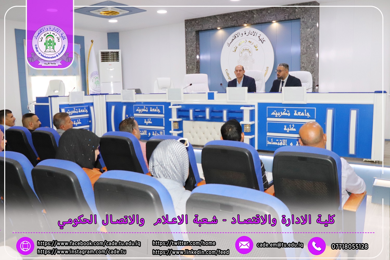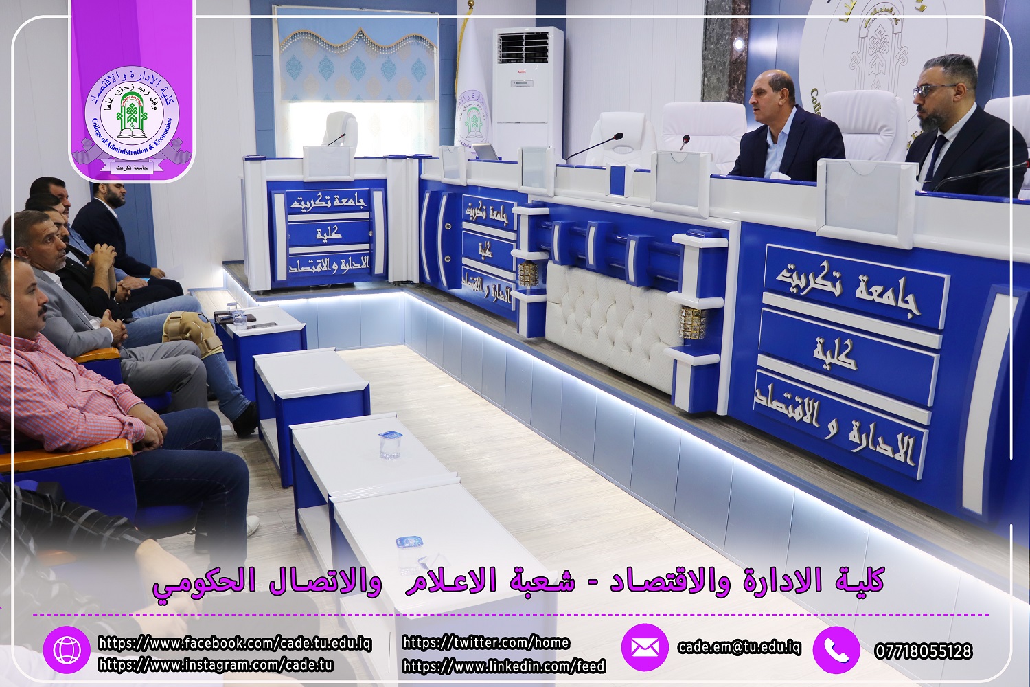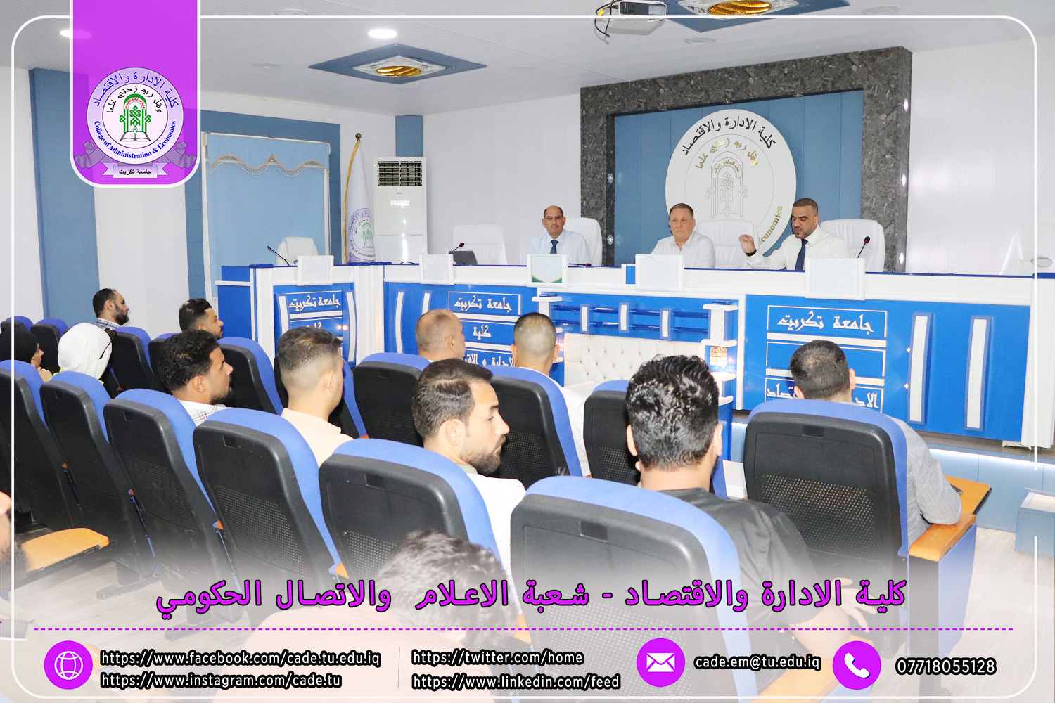 برعاية الأستاذ الدكتور وعد محمود رؤوف، رئيس جامعة تكريت، وبإشراف الأستاذ المساعد الدكتور فؤاد فرحان حسين، عميد كلية الإدارة والاقتصاد، نظمت وحدة التأهيل والتوظيف والمتابعة ندوة علمية حضورية بعنوان: "ريادة الأعمال – الفرص والتحديات"، وذلك يوم الاثنين الموافق 14 /4/ 2025، على قاعة قسم ادارة الاعمال في كلية الإدارة والاقتصاد.