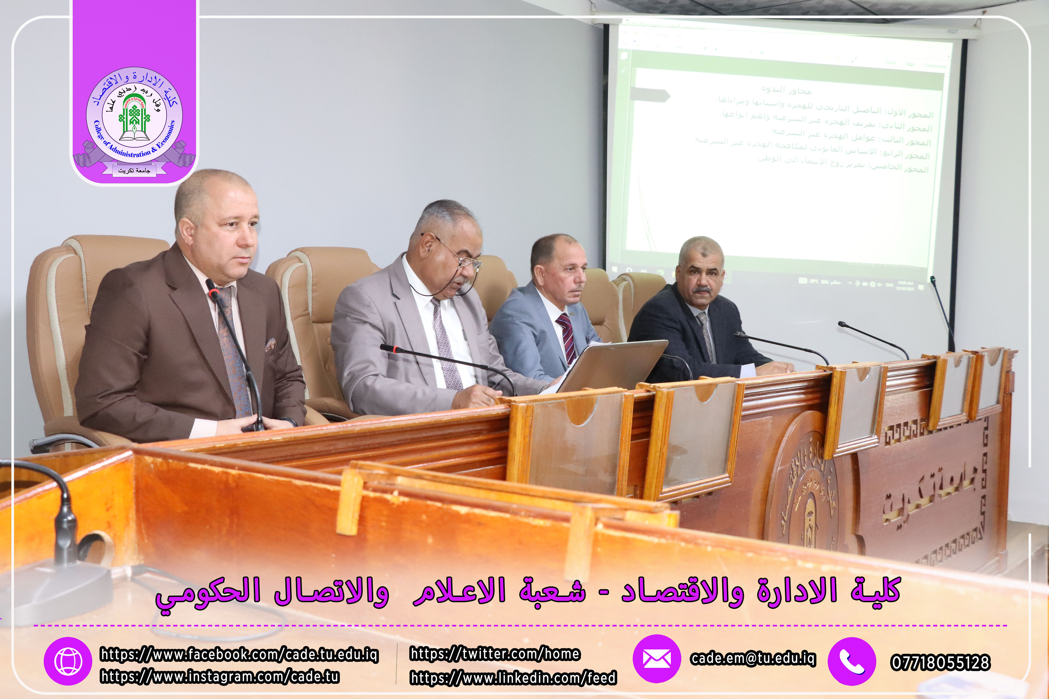 برعاية الأستاذ الدكتور وعد محمود رؤوف، رئيس جامعة تكريت، وبإشراف الأستاذ المساعد الدكتور فؤاد فرحان حسين، عميد كلية الإدارة والاقتصاد، نظّمت وحدة الإرشاد النفسي والتوجيه التربوي في الكلية وبالتعاون مع دائرة الهجرة والمهجرين في محافظة صلاح الدين، ندوة علمية بعنوان: رفع المخاطر وتداعيات الهجرة غير الشرعية وتعزيز روح الانتماء للوطن"، وذلك يوم الثلاثاء الموافق 28/10/2025، في تمام الساعة العاشرة صباحاً على قاعة قسم إدارة الأعمال.