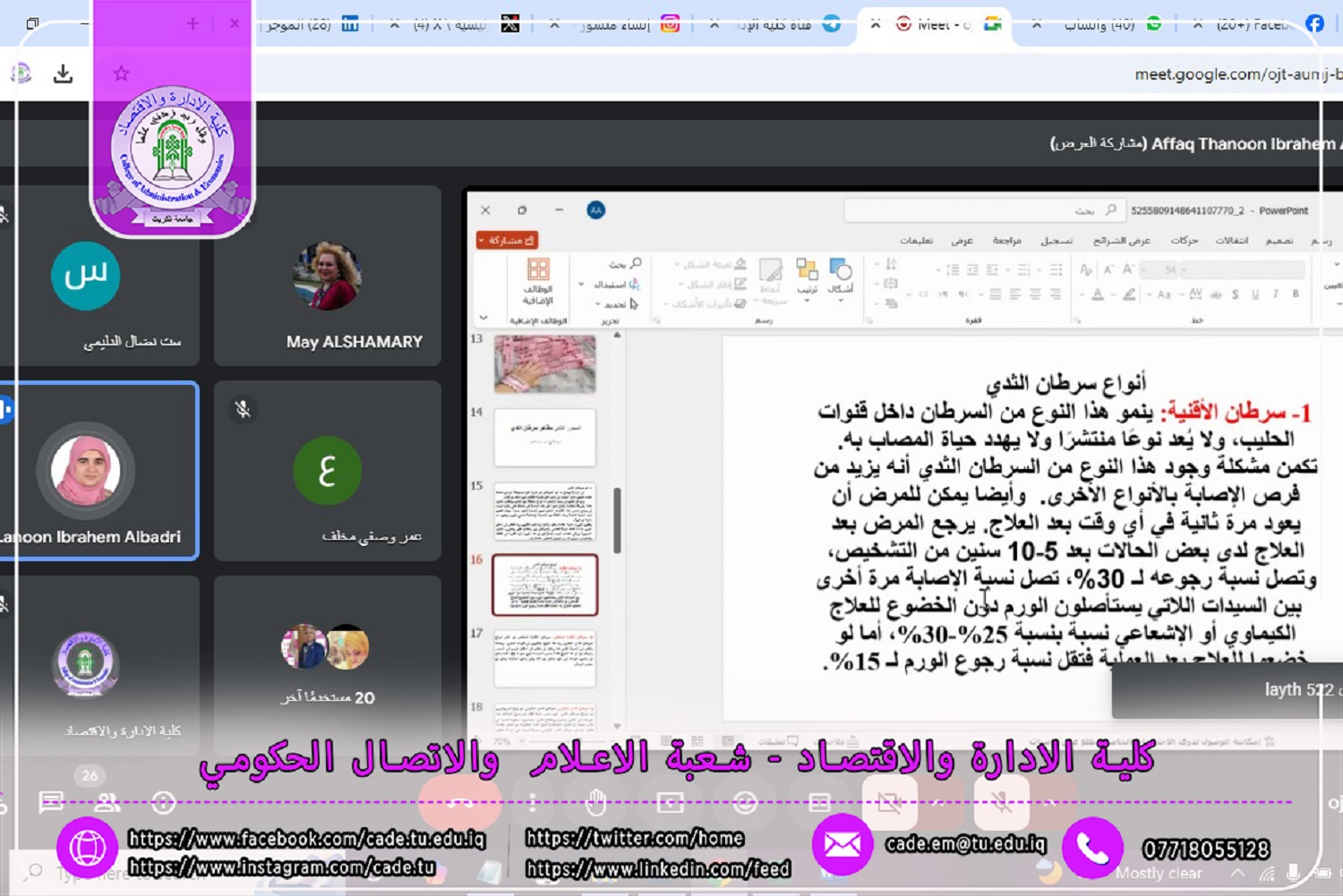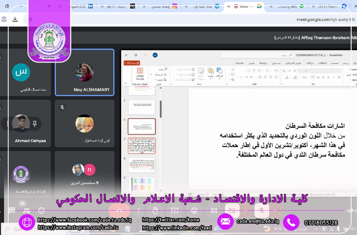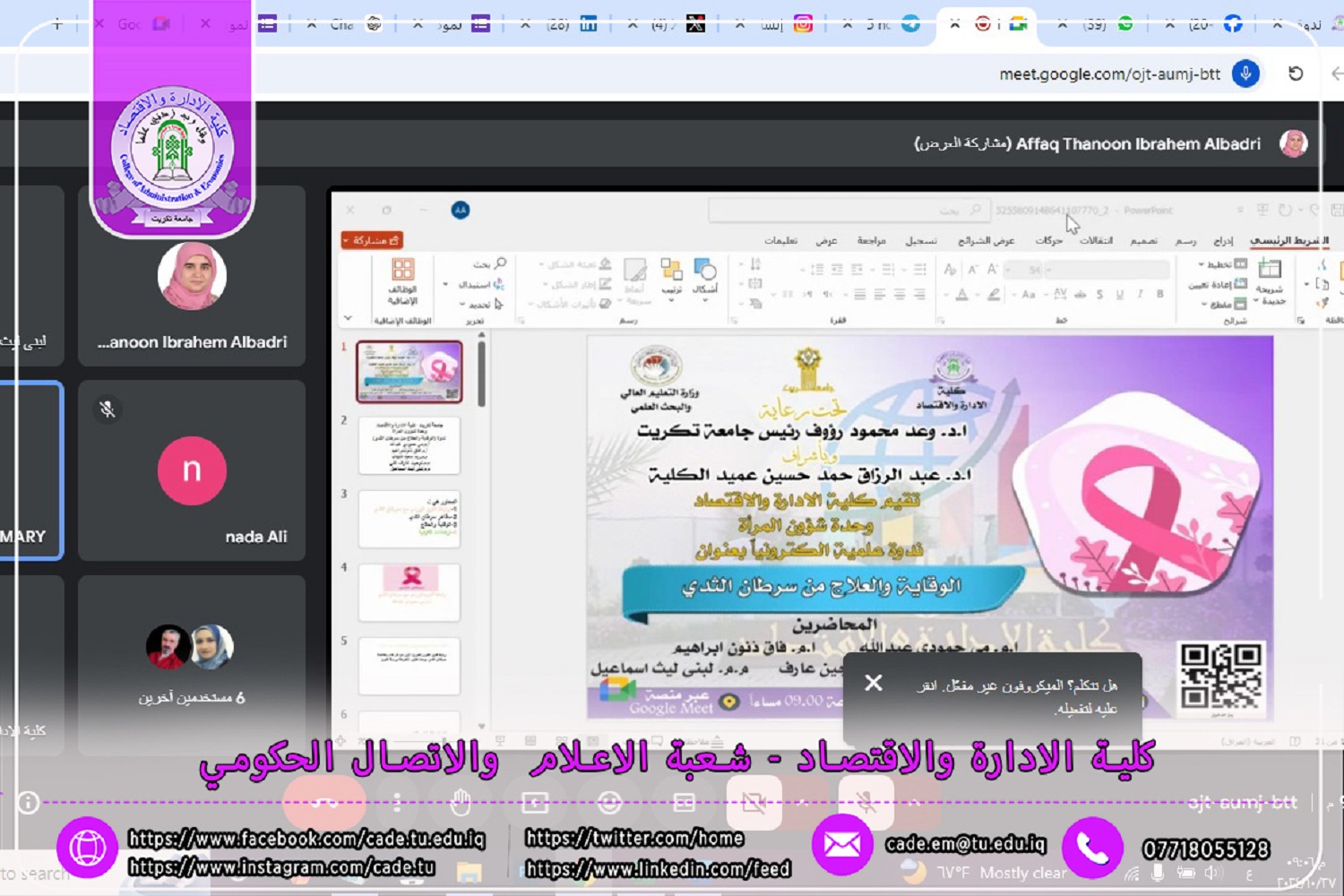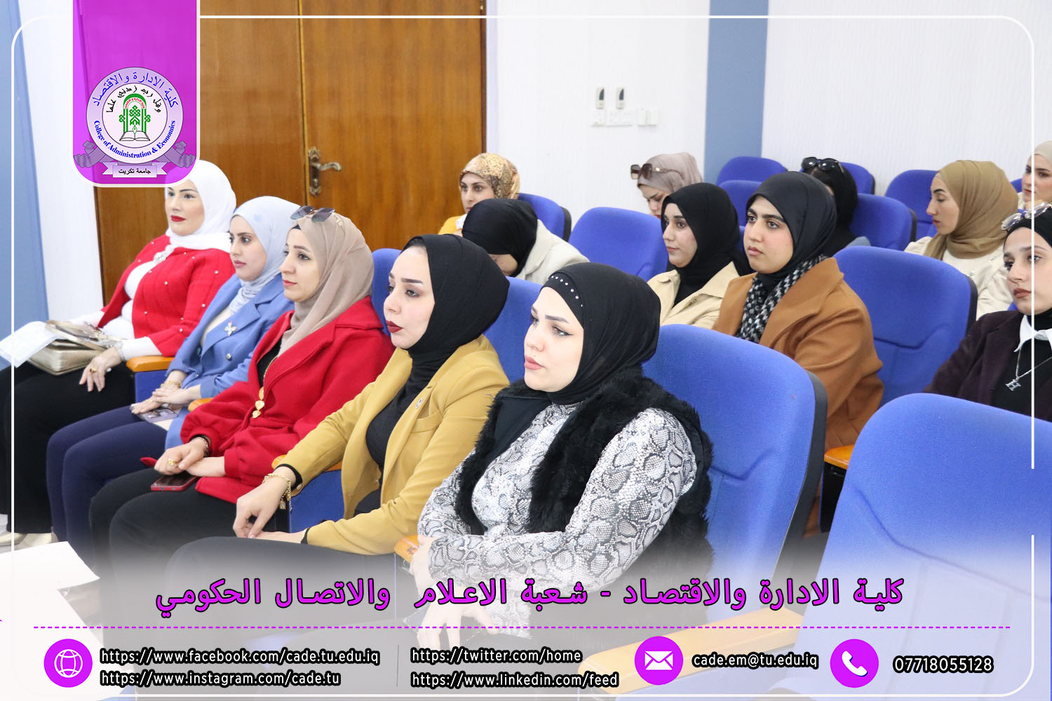 برعاية الأستاذ الدكتور وعد محمود رؤوف، رئيس جامعة تكريت، وبإشراف الأستاذ الدكتور عبد الرزاق حمد حسين، عميد كلية الإدارة والاقتصاد، والأستاذ المساعد الدكتور سياف عبد حسين، مدير مركز التعليم المستمر، وفي إطار تنفيذ الخطة الوطنية الثالثة للمرأة والأمن والسلام ضمن ركيزة المشاركة والإصلاح المؤسسي المحور الثالث المتضمن محور التنمية البشرية وصنع القرار وتعزيز قدرات المرأة ودورها في المجتمع ،نظّمت وحدة شؤون المرأة وبالتعاون مع مركز التعليم المستمر ندوة علمية حضورية بعنوان "بناء قدرات المرأة لتعزيز الإبداع"، وذلك يوم الاثنين الموافق 2025/2/17، على قاعة د. محمد بدع.