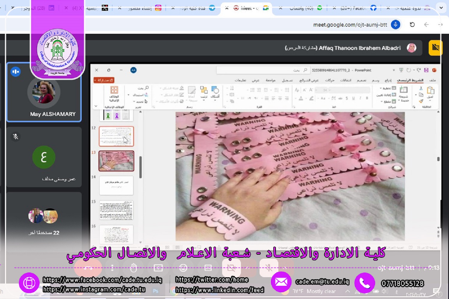 شارك في تقديم الندوة كل من، م.م. ريم سعيد شهاب، وم.م. حنان محمد إبراهيم، حيث تم تسليط الضوء على دور المرأة كركيزة أساسية في بناء المجتمع وتنميته، وامتلاكها لقدرات إبداعية هائلة يمكن توظيفها في مختلف المجالات. كما تناولت الندوة أهمية تمكين المرأة وتطوير مهاراتها لتعزيز مساهمتها في العمل والحياة الاجتماعية.