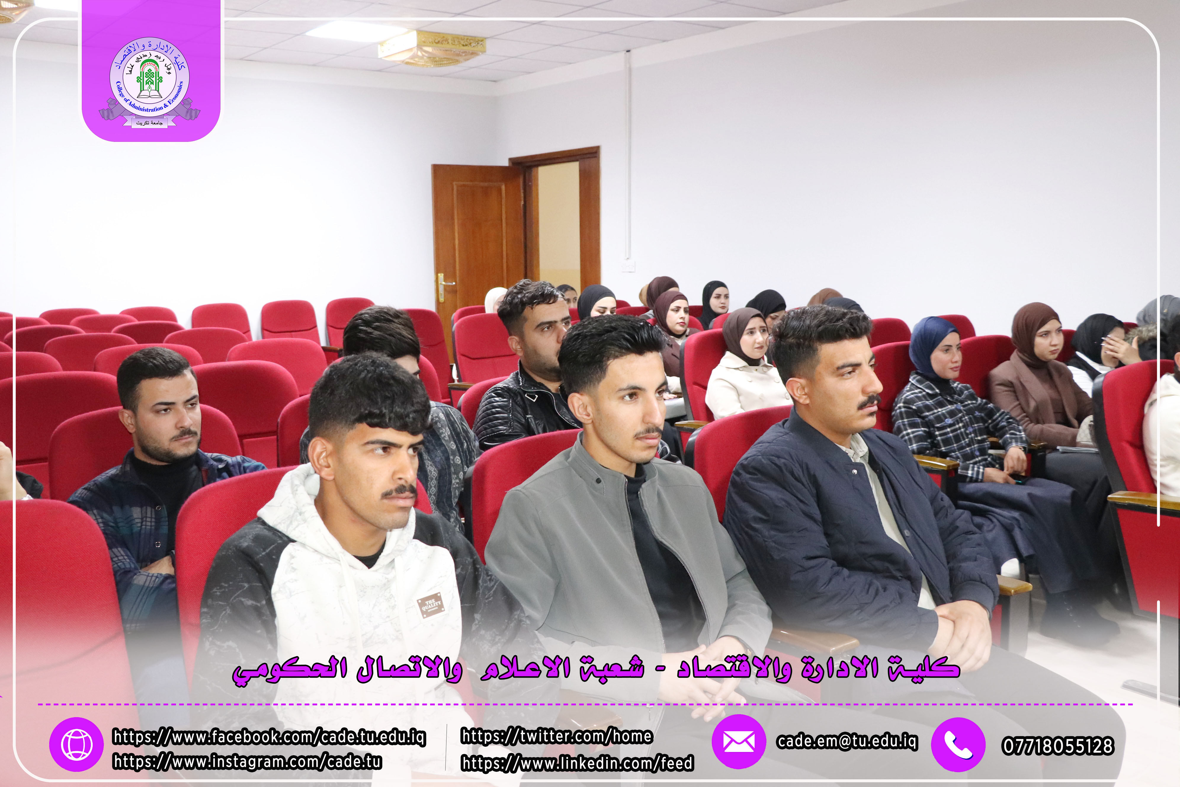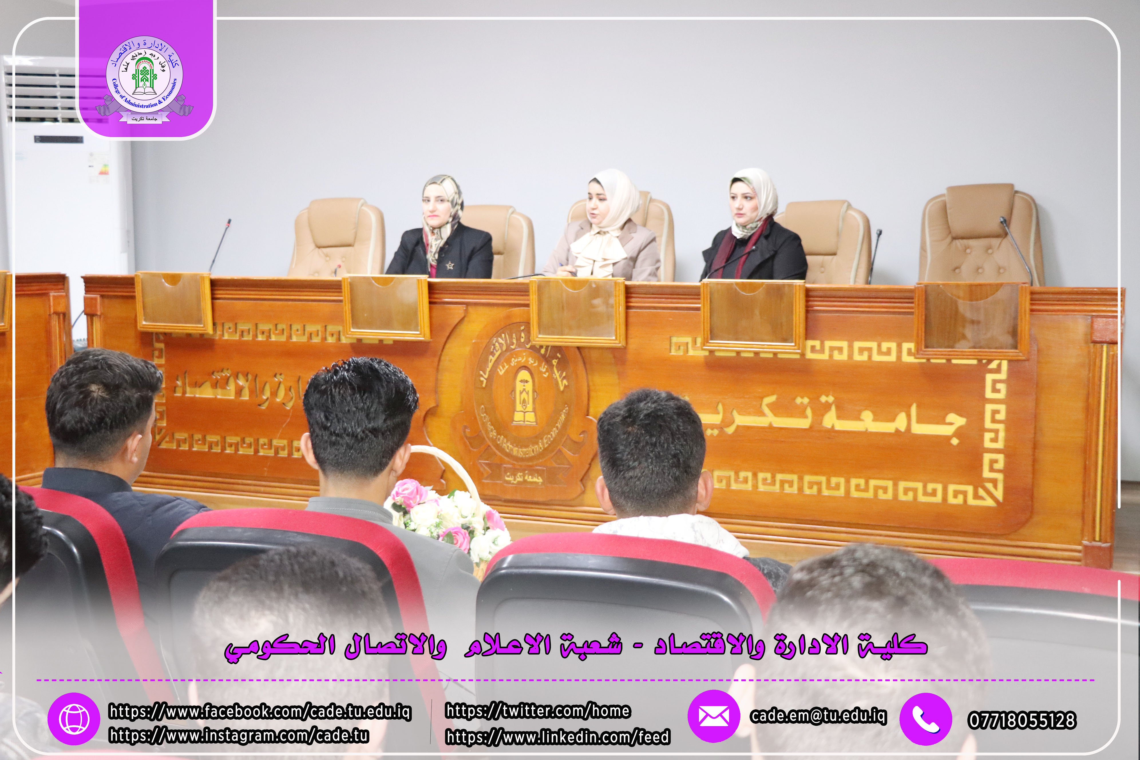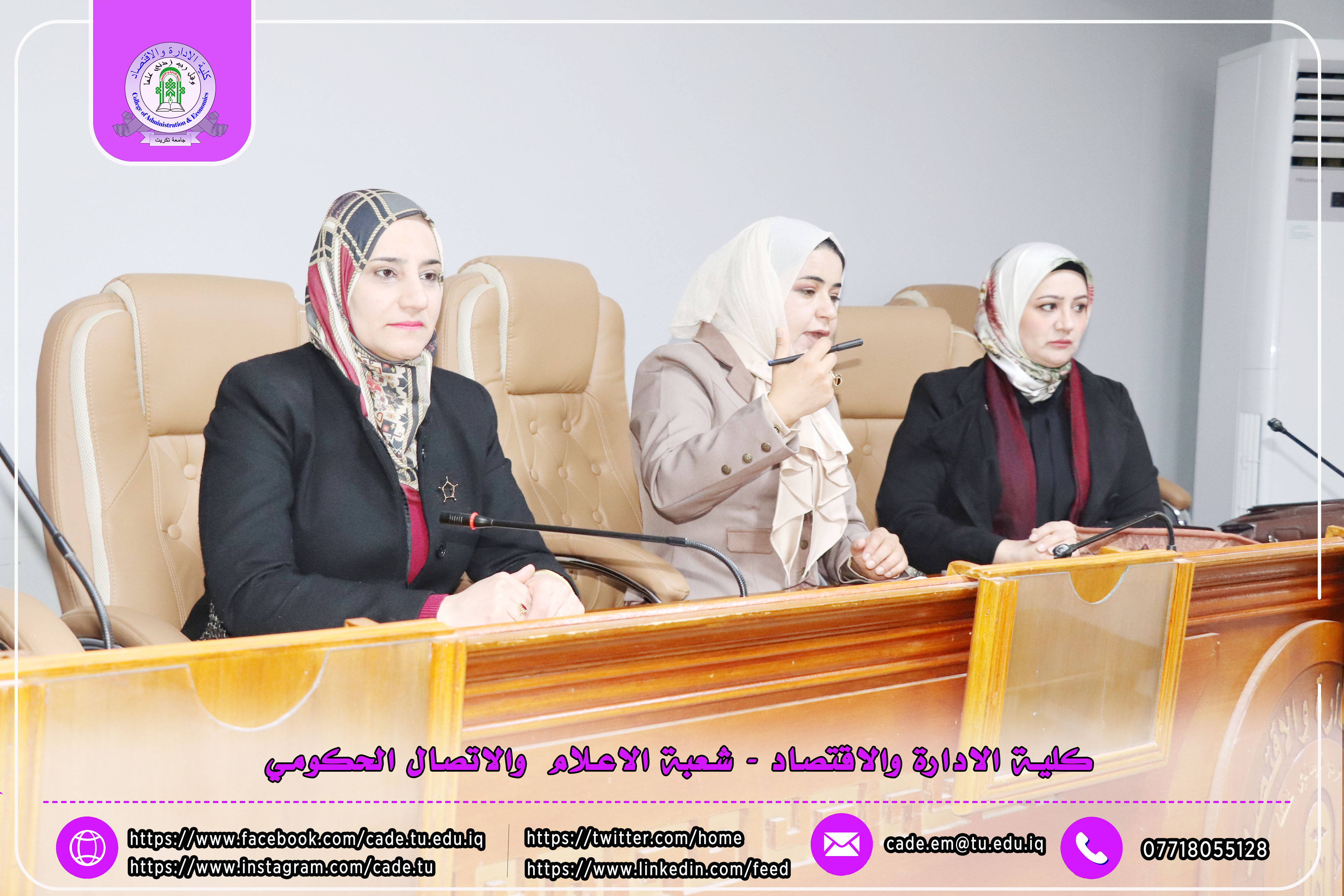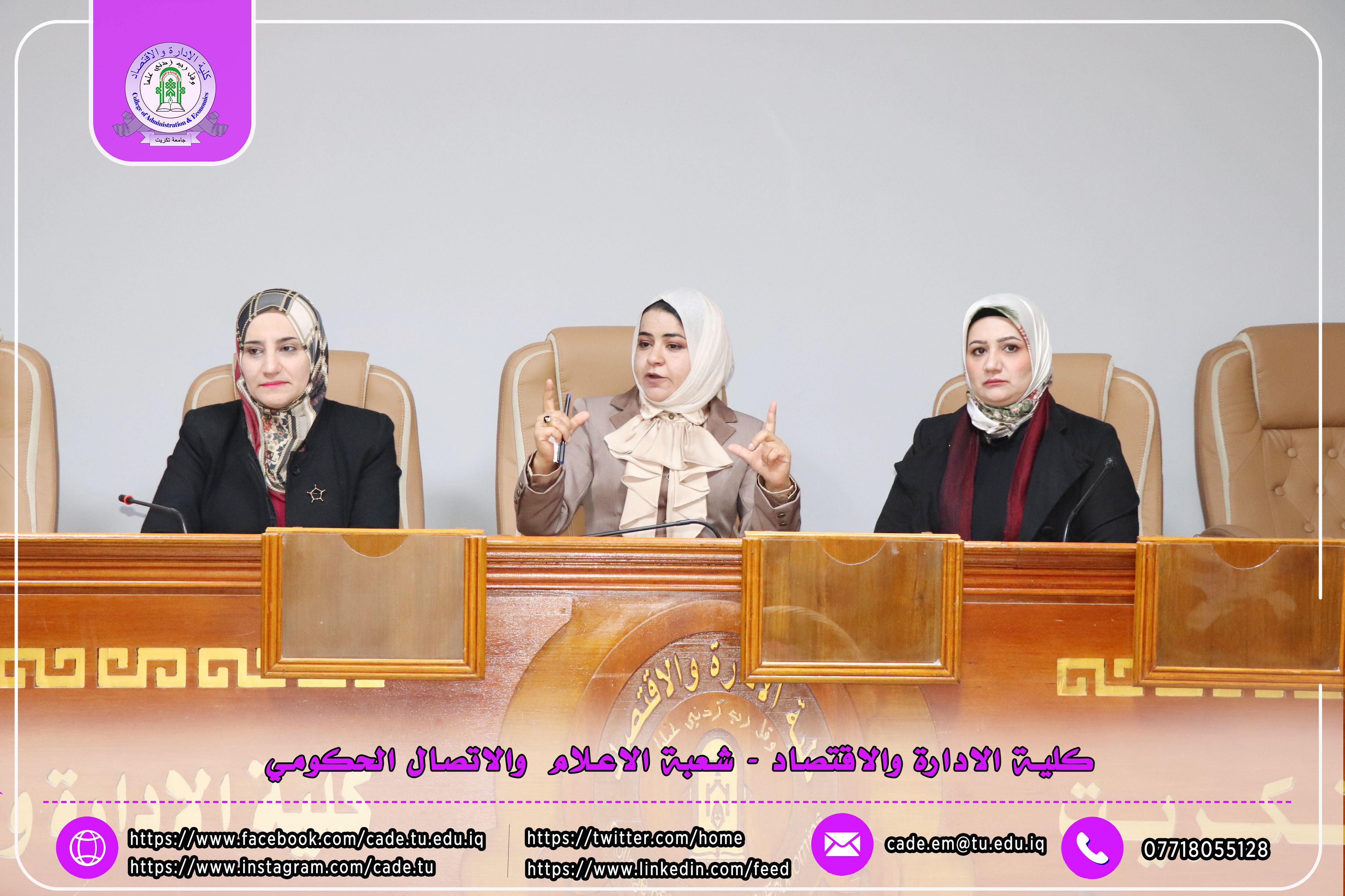 برعاية الأستاذ الدكتور وعد محمود رؤوف، رئيس جامعة تكريت، وبإشراف الأستاذ المساعد الدكتور فؤاد فرحان حسين، عميد كلية الإدارة والاقتصاد، أقامت عمادة الكلية / وحدة شؤون المرأة ندوة علمية بعنوان (بناء القدرات الرقمية: من أساسيات التكنولوجيا إلى مهارات التسويق الرقمي)، وذلك يوم الثلاثاء الموافق 10/2/2026 على قاعة قسم إدارة الأعمال.